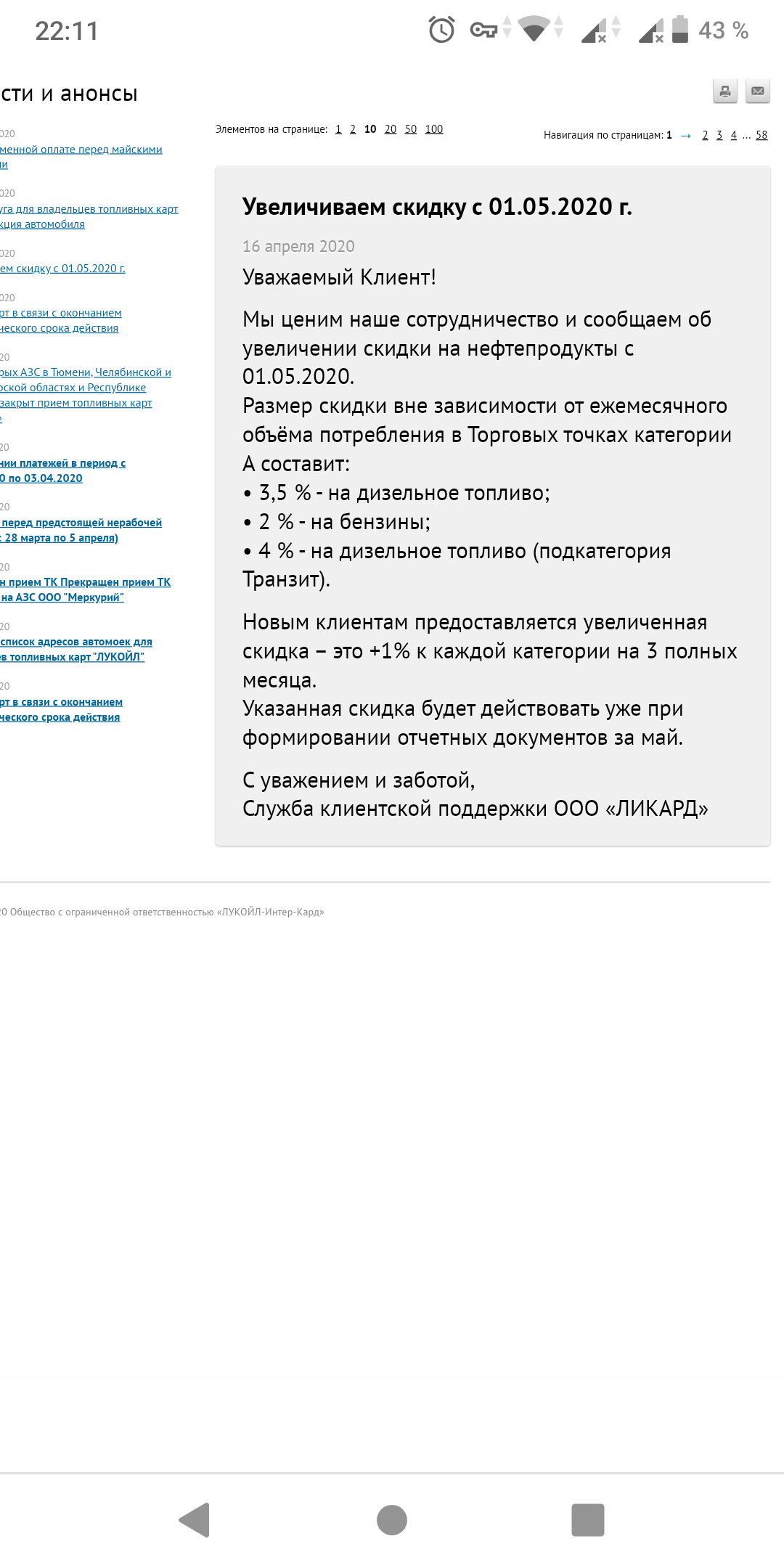 @Borhes, @kolxoznikoff, Новость из личного кабинета от 16.04.2020 года: Увеличиваем скидку с 01.05.2020 г. 16 апреля 2020 Уважаемый Клиент! Мы ценим наше сотрудничество и сообщаем об увеличении скидки на нефтепродукты с 01.05.2020. Размер скидки вне зависимости от ежемесячного объёма потребления в Торговых точках категории А составит: • 3,5 % - на дизельное топливо; • 2 % - на бензины; • 4 % - на дизельное топливо (подкатегория Транзит). Новым клиентам предоставляется увеличенная скидка – это +1% к каждой категории на 3 полных месяца. Указанная скидка будет действовать уже при формировании отчетных документов за май. С уважением и заботой, Служба клиентской поддержки ООО «ЛИКАРД»