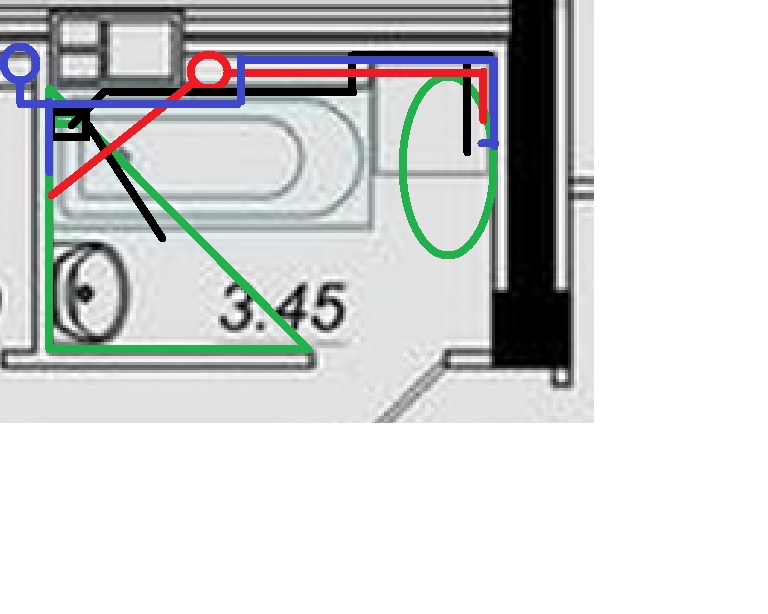 Накидал план. Черное - каналья Синее - ХВС Красно - ГВС Зеленое - ванна и умывальник. Серый прямоугольник в левом верхнем углу - вентканал