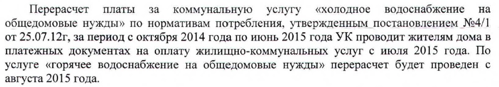 Не совсем понятно, что имеется в виду. У нас (УК ЦР) в июльской так: Т.е. расчет НЕ по нормативу, но вроде похоже на перерасчет. Что это вообще - мне доподлинно не известно, т.к. ни до ИВЦ, ни до УК я не дозвонился. А можете скан или фото этого места в Вашей платежке выложить?
