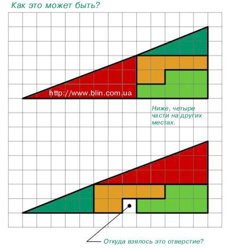 Элементарно. Во втором случае, гипотенуза прямая, в первом она состои из двух вогнутых линий. Вот из-за этого и исчезает квадрат.