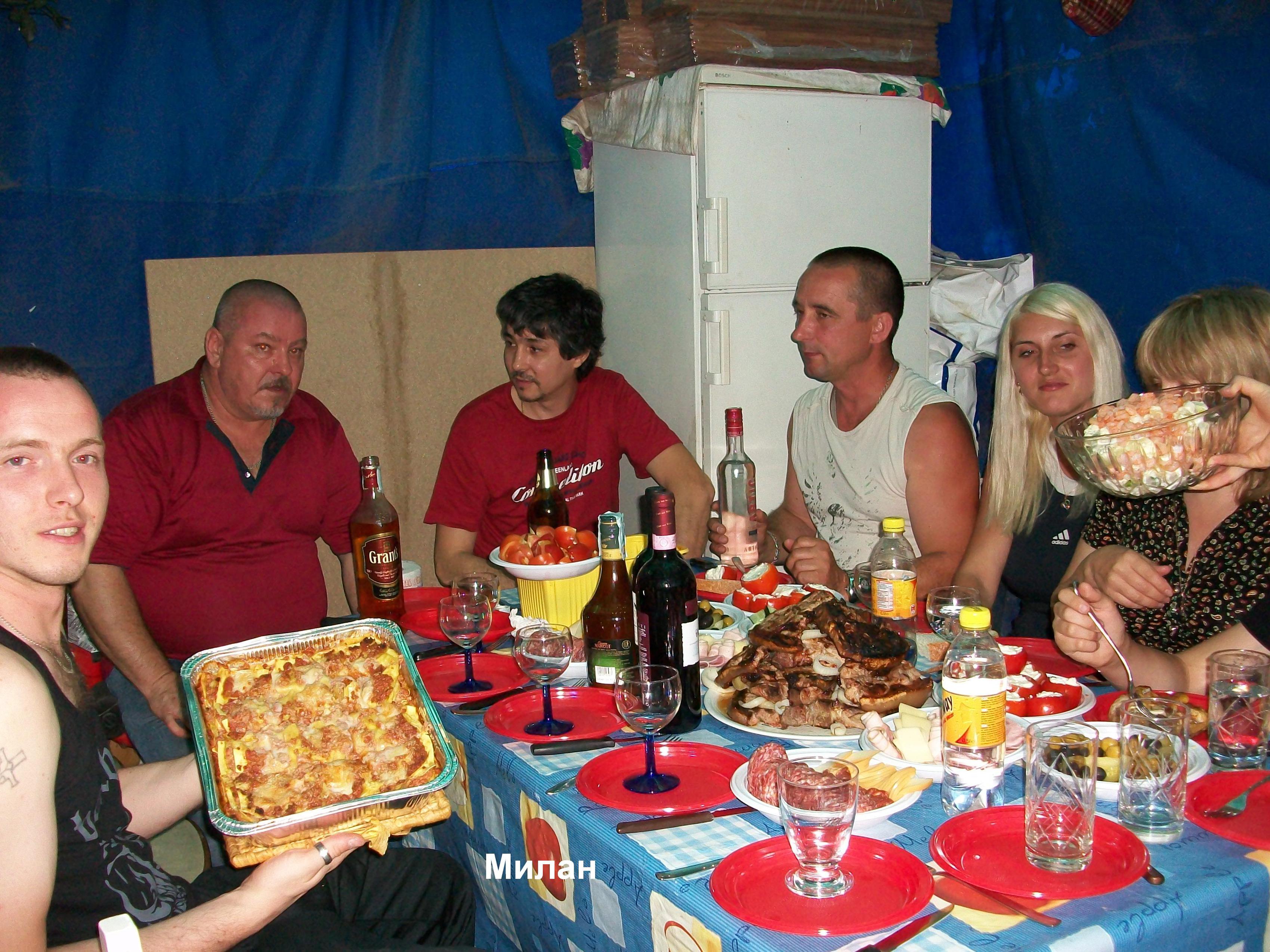 Аааа. Теперь понял. Стало быть недоверие какое то ко мне. А ведь по фото четко видно что это Милан. (надпись четко указывает ). За столом сидят и русские ( из Курска кажется ) и украинцы (привет Серега ! ) и румын Мирча чернявый . А почему посуда пластиковая -так то просто ! . Живет Мирча этот в типа частного сектора. Огород там у него-земля-речушка в том огороде. Вот и решили мы там шашлык-костер и прочее. Конечно если даст Бог еще поеду к ним-я им укажу на такое свинство и буду требовать фарфор и бокалы из венецианского хрусталя. Дабы как нажремся потырить это все за пазуху у буржуев-предателей-перебежчиков !
