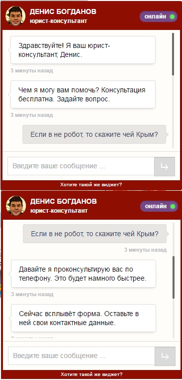 Не, не лёг. Я задал вопрос: "Чей Крым? Российский или украинский?" Ту же ботву выдал. Ваще же бесят эти боты. Реально думают, что повысят продажи.