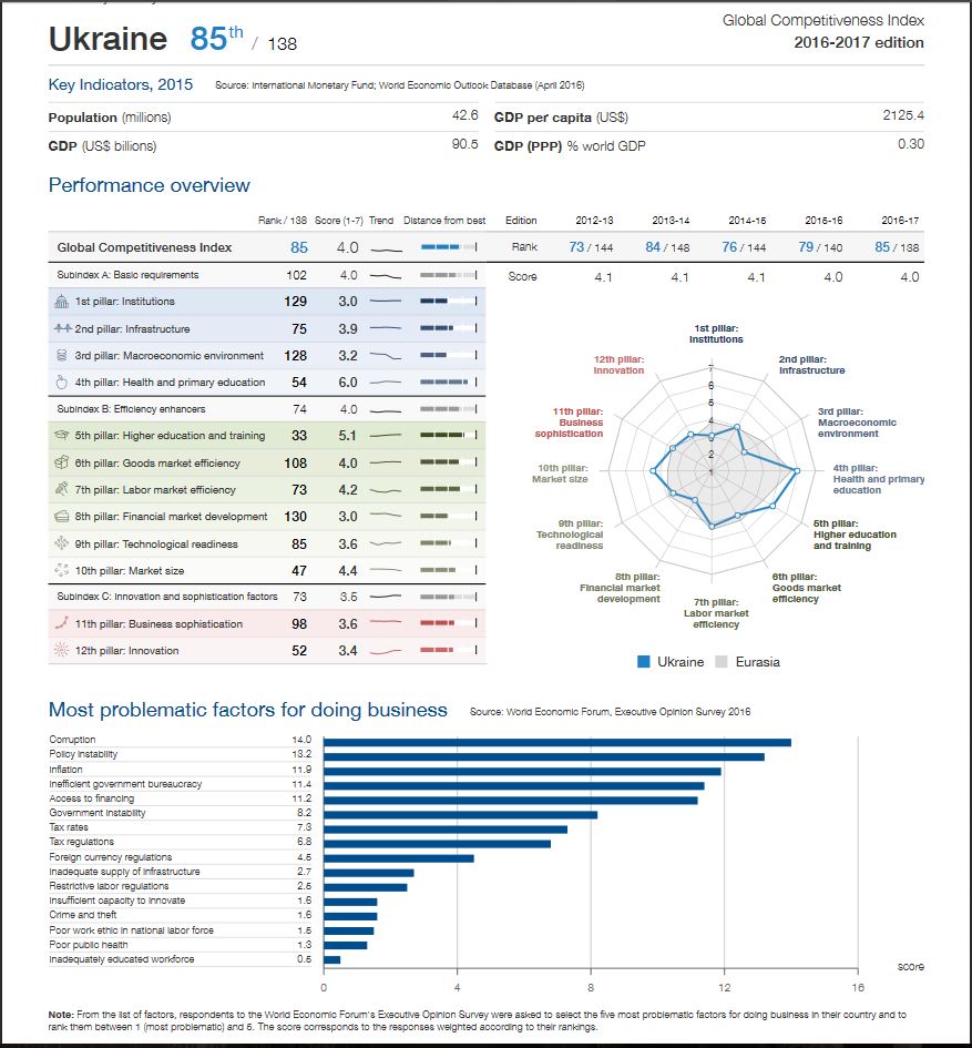 Если посмотреть весь доклад, Россия с 2012 года поднялась с 67 места на 43 место, Украина опустилась с 73 места на 85.