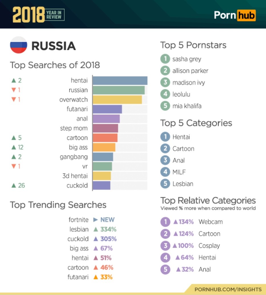 Анал, БДСМ, всякое blowjob и жесткое гонзо - это популярно в любой стране, в первую очередь потому что в повседневной жизни люди это редко практикуют, а посмотреть интересно. Интернет и цифровые технологии избаловали пользователя. Ванильное порно в стиле private сейчас уже мало кому интересно. Россия не исключение. Популярность косплея, хентая, манги говорит высоком проценте юной аудитории. Вообще эти темя в РФ популярны, и не только в порно. Странный вопрос для вроде как активного пользователя Интернета. Сайт фиксирует IP и геоданные посетителя, его оборудование, тип ОС и браузера. Доля Apple на мобильном рынке в РФ примерно 35% в деньгах и 15% в штуках. Это в общем-то хороший показатель - в Западной Европе примерно такие-же показатели. Отсюда и преобладание платформы Андроид в статистике посещений сайта. Это не так. Ваша статистика не о чем не говорит. Она лишь показывает статистику по вашему сайту. На днях обедал со знакомым, который недавно купил дом за 250 млн. У него Самсунг, у его жены Самсунг. Это наверное из-за финансовых трудностей. Если брать мужскую часть моего круга общения, большинство пользуется Андроид устройствами. У женской части наоборот - в основном Айфоны последней модели. Но что-то подсказывает что социальный статус и уровень образования тут ни при чем.