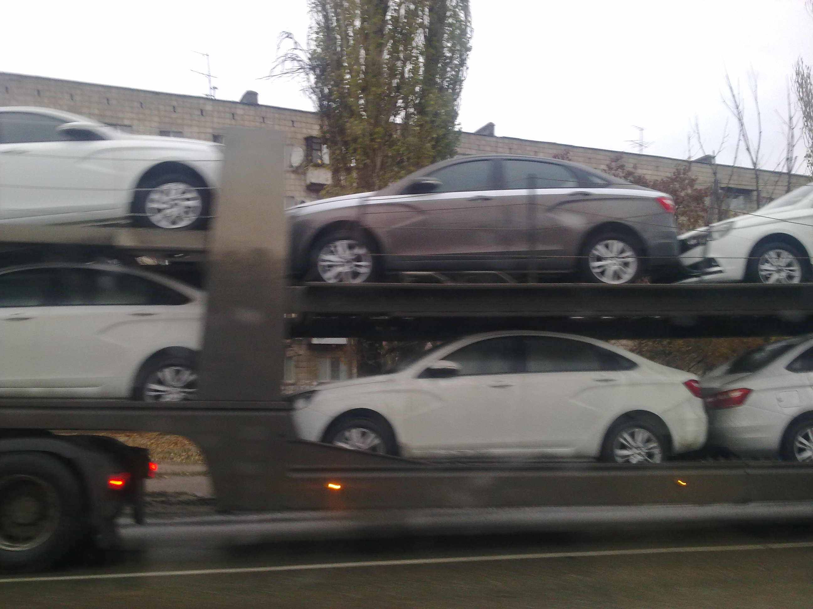 Сегодня у Водстроя два автовоза с Вестами, на первом прям весёленькие цвета были машин, оклеены прям как иномарки транспортировочной плёнкой. Это второй. расцветки обычные