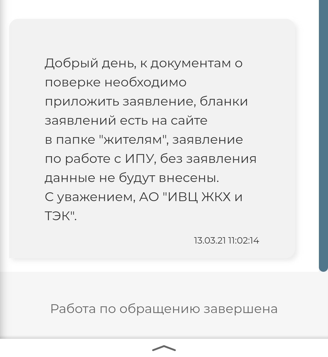 @кошак,я свои обращения через ЛК сдабриваю вот такой фразой:«Ответ направить на указанную в личном кабинете электронную почту в сроки соответствующие законодательству РФ об обращении граждан .»,через 10 дней ответ от ИВЦ цитирую дословно«Добрый день, Аванс обазовался в результате перерасчета тепловой энергии для ГВС в октябре 2019г . С уважением, АО "ИВЦ ЖКХ и ТЭК".» Обращение закрыто. Писала в ЛК ,я хотела сверку взаиморасчетов,ответ пришел мне на почту, потом посмотрю в ЛК может и там есть.Волшебную фразу использую всегда в переписках с инстанциями.Попробуйте ,может сработать.