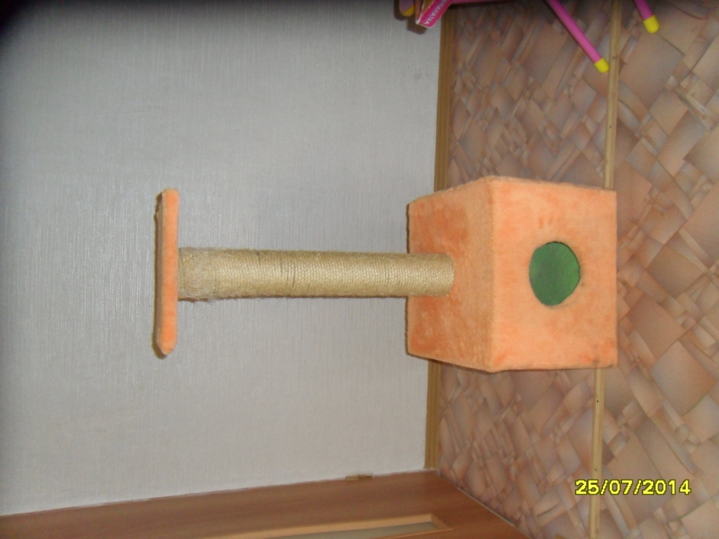 Кошка не поладила с ребенком и ушла в добрые руки, добрые руки дом не захотели, поэтому продается за себестоимость материалов. Кошка дом очень любила, точила когти только на нем, зимой спала внутри, летом на верхней полке. Корпус сделан из толстого ДСП это придает дому устойчивость, кошка его перевернуть или сдвинуть не в силах. Когтеточка из настоящего сизалевого каната он почти в идеальном состоянии. Обивка искусственный мех. внутри обивки нет, просто съемная подушка, зелёная ;-) так захотелось. Высота 110см; Высота когтеточки 68см; Ширина дома 47см; Глубина дома 47см; труба снимается, можно увезти в любой машине. для участников форума 1000р.