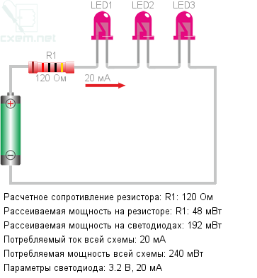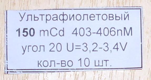 таким образом. А точный номинал будет зависеть от партии светодиодов (от прямого падения напряжения на них при заданнном токе). 100 ом даст где-то 30 мА току. Если нужно меньше тока, можно и 120, и 150 Ом поставить. Хотя у УФ СД какое падение, я честно говоря не знаю. ---------- Сообщение добавлено 14.03.2015 06:21 ---------- так там не один резистор нужен, а 50 или сколько там у нас светодиоды LGIT уже полтора года светят, уменьшение яркости не увидел ни я, ни люксметр. Может быть причина в качестве приборов?
