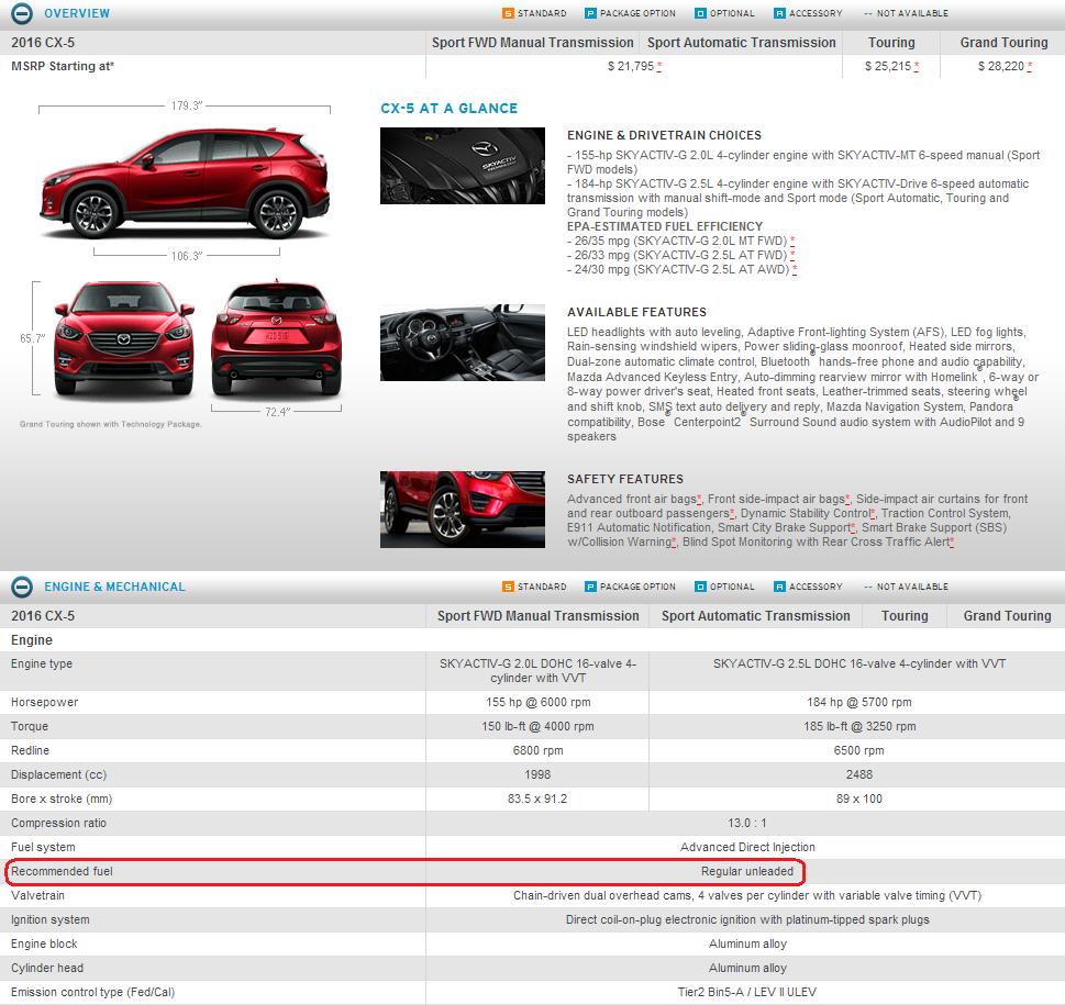 Рекомендован "Regular unleaded", это самый дешёвый бензин на американском рынке. Октановое число 87. У меня какая-то другая CX-5?