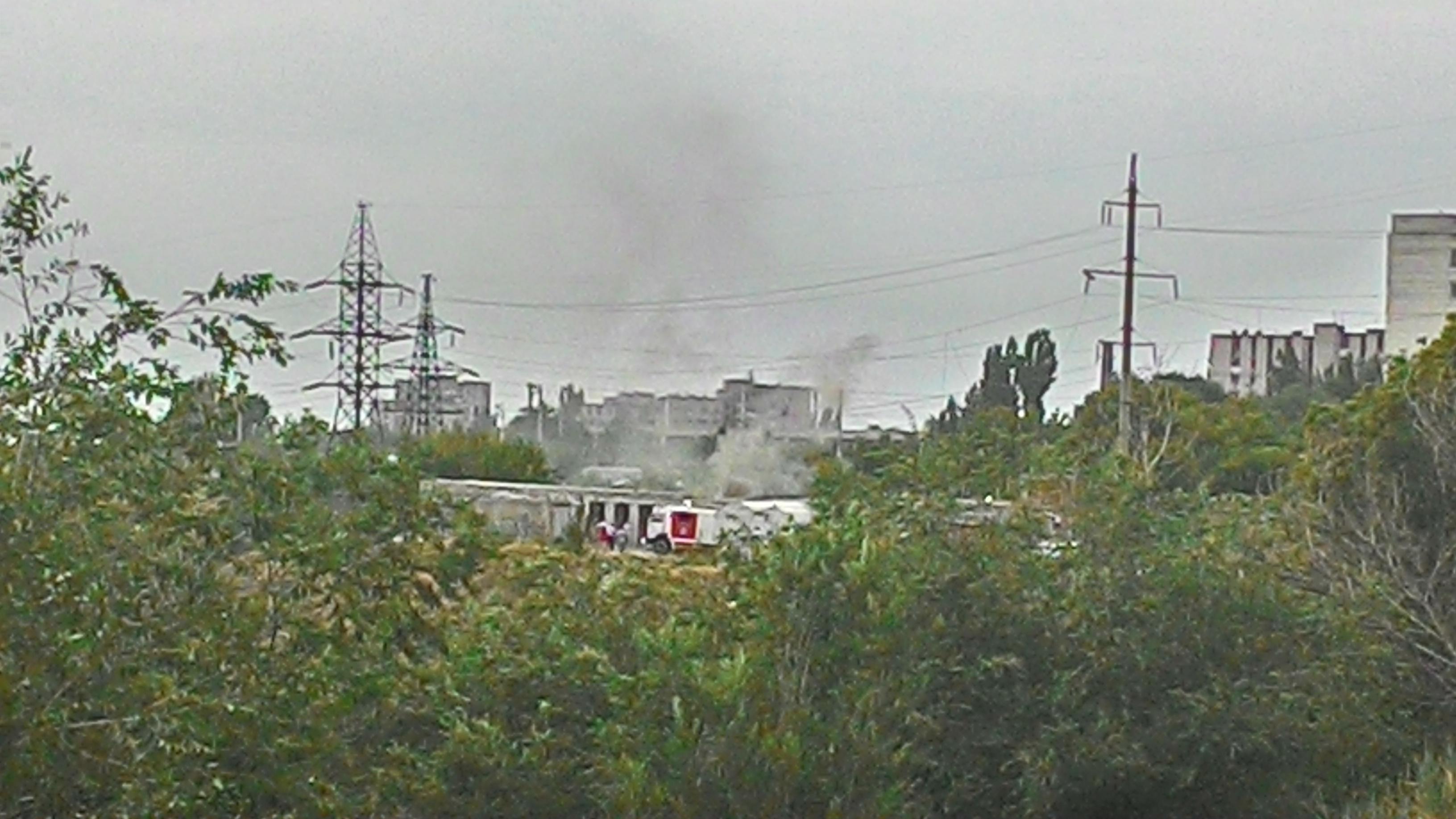 Если не ошибаюсь 110кВ. Шоу продолжается. Прибыли МЧСники. Похоже вскрывали один из гаражей - повалил дым.