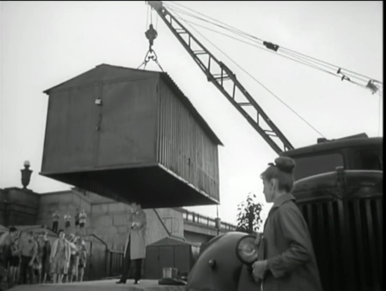 И шоу снова продолжается. На то же место снова пригнали кран. Пока ничего не оборвали. Снимают плиты с гаражей, кажется. Ждем продолжения.