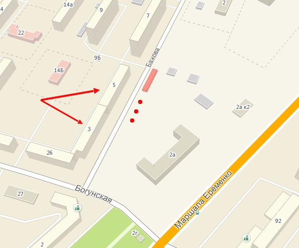 Вопрос. Мой дом на Бажова, а через тропинку больница. Красными точками я обозначил контейнеры, которые больничка перенесла к забору, что между домами и больничкой. Есть подозрения что в эти контейнера скидывают биологические отходы. Потому как вонь стоит неимоверная. Раньше контейнеры стояли в другом месте, в глубине территории, там где сейчас ветеринарная клиника. Короче окна открыть просто нельзя, что сейчас, летом, просто невыносимо. Дышать нечем. Кому пожаловаться ? Кто проверит правильность установки контейнеров и что туда выбрасывают ?
