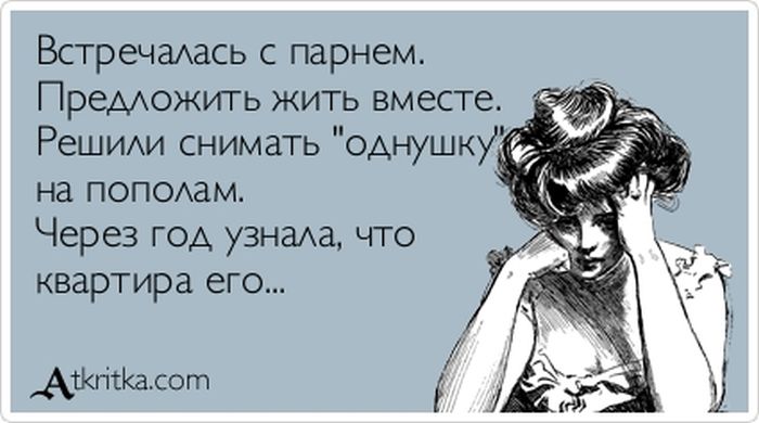жесть нафиг жить с кем то. автор думает что наверно это приятно и эротично. ога. даже если поселится симпатичная дама - поразвесит везде свои труселя, в мойке будут валяться ее длинные волосы а их соседней комнаты раздаваца храп любовников.