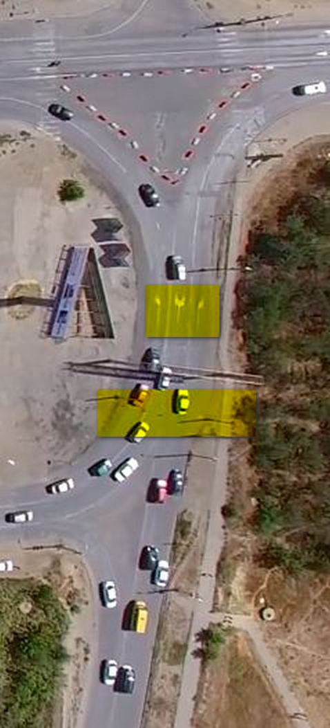 Желтым выделена зона висящих знаков и разметка на асфальте - все полностью соответствует плану