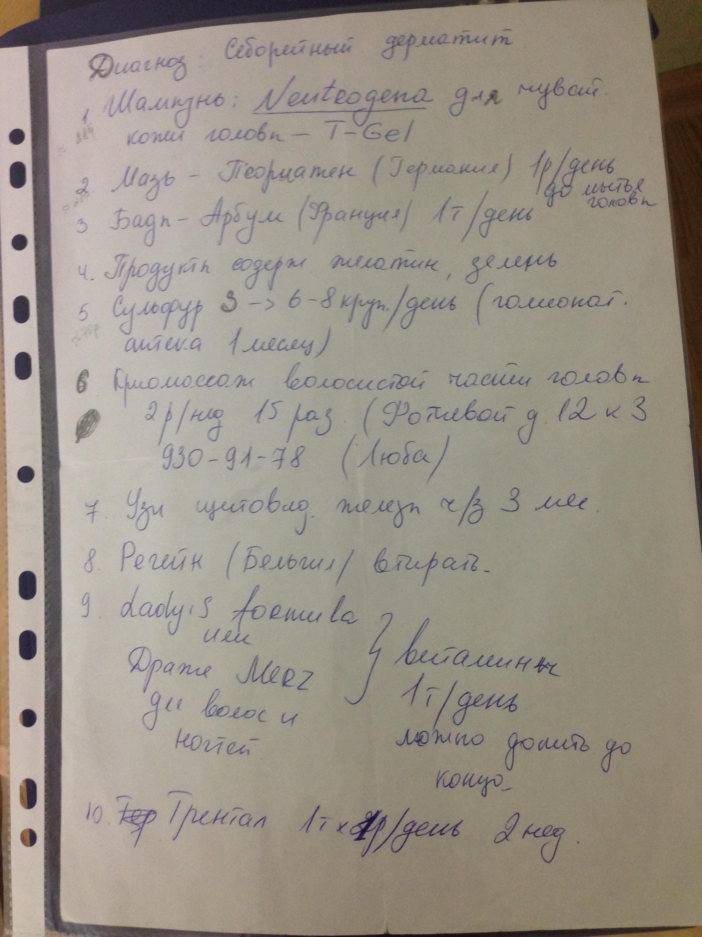На листке рекомендации по лечению когда я впервые обратилась к врачу. Шампунь и бальзам на втором фото, отлично справляются, голова прям чистая после них, но они оч дорогие. На пробу взяла Агафью, меньше сыпется, но совсем не исчезает.
