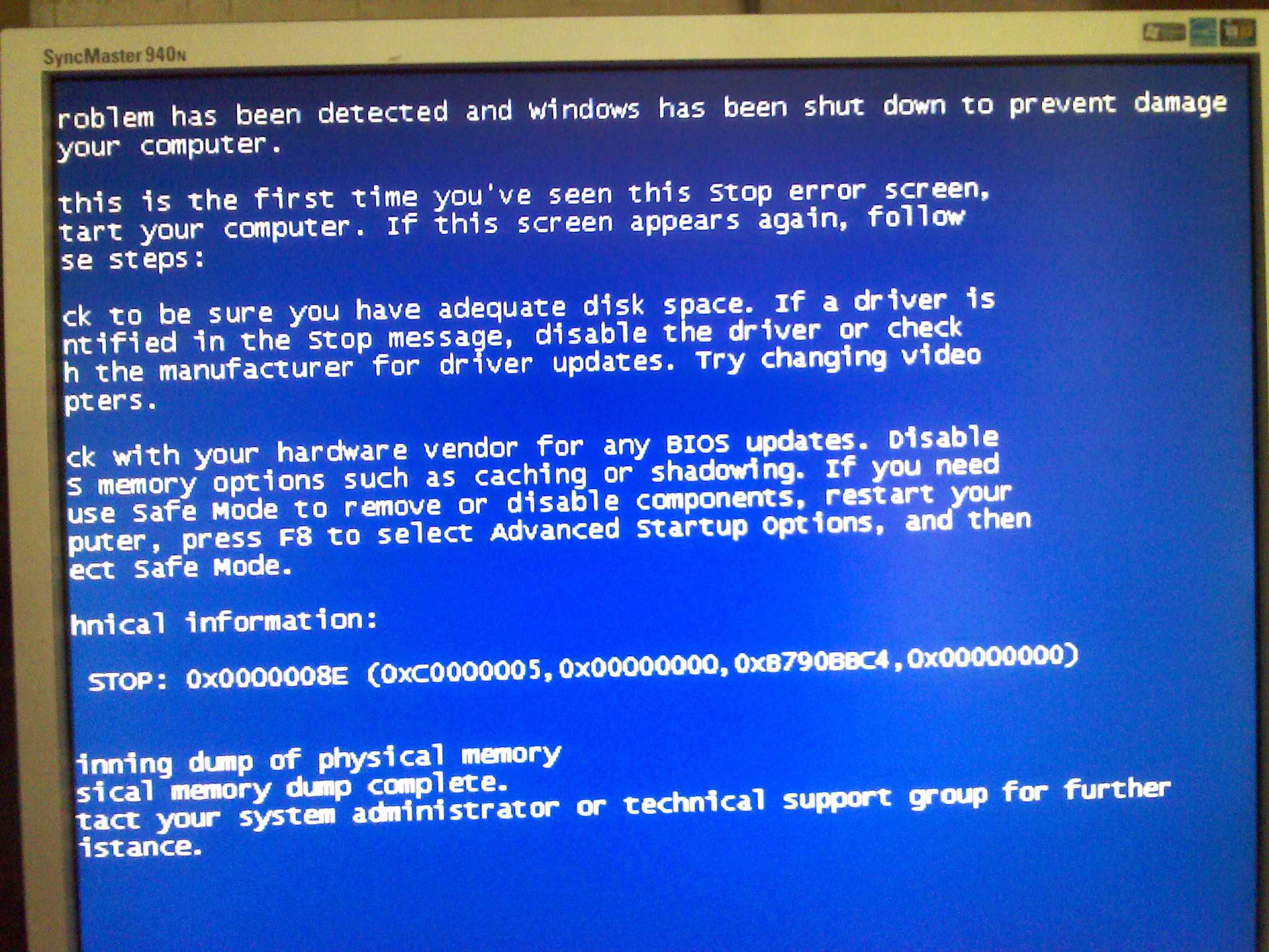 такая штука, перевелось как-то так: проблема была обнаружена, и окна был закрыт, чтобы предотвратить, повреждают Ваш компьютер. это - первый раз, когда Вы видели этот ошибочный экран остановки, перезапустите свой компьютер. Если этот экран появляется снова, выполните se шаги: сойдитесь со своим продавцом аппаратных средств для любых обновлений BIOS. отключите варианты памяти, такие как кэширование или затенение. Если Вы должны использовать безопасный способ, чтобы удалить или отключить компоненты, перезапустить Ваш компьютер, нажмите F8, чтобы выбрать Продвинутые опции запуска, и затем избранный безопасный способ. остановите 0x0000008E свалка подачи физической памяти память sical сваливает полный. такт Ваш системный администратор или группа технической поддержки для дальнейшего расстояния