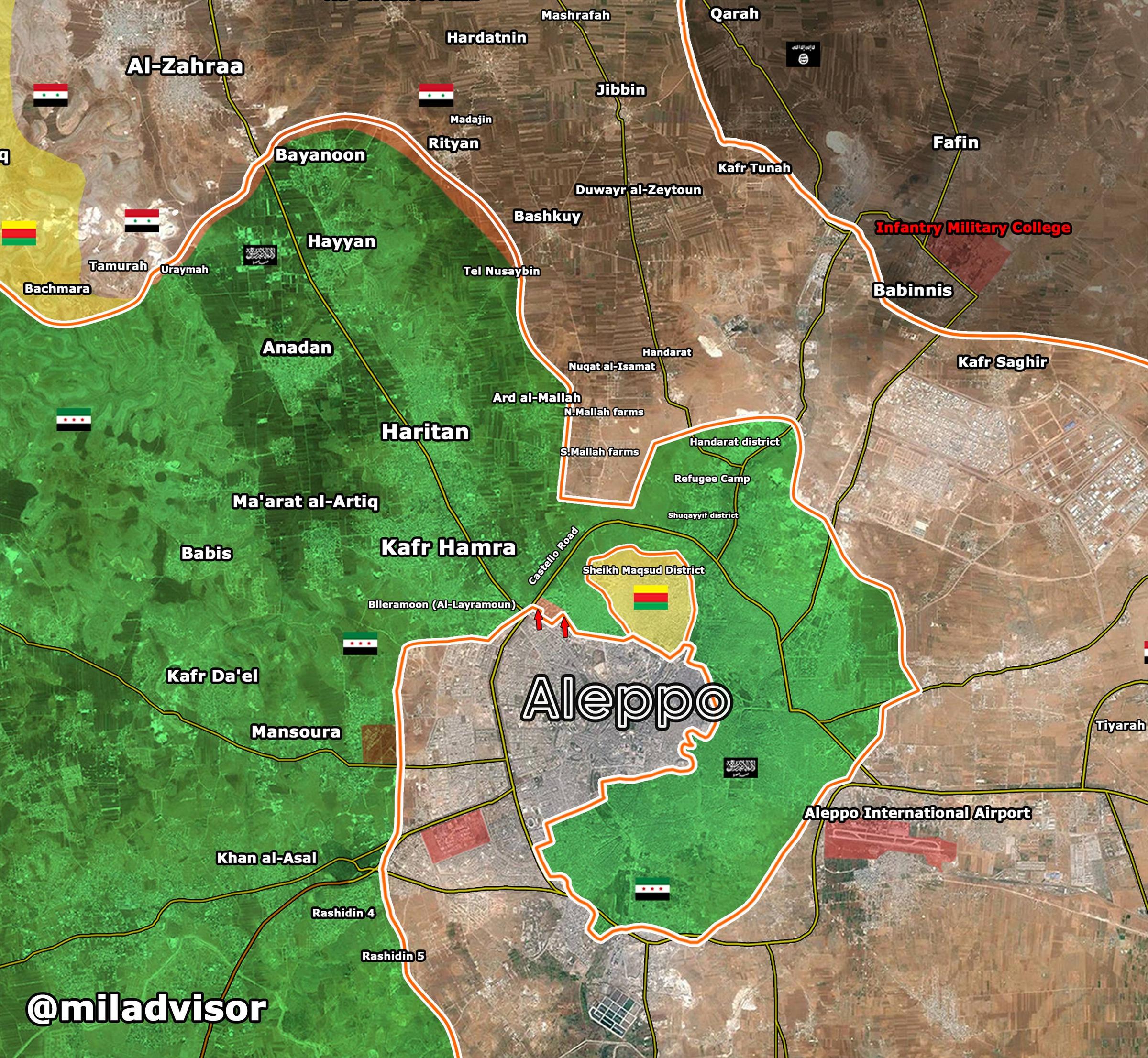 негодяй, получите ). Судя по темпам продвижения САА за последнии два дня, туркам пока не до зелёных побратимов. Только не забывайте, что в этом котелке ещё несколько десятков тысяч мирняка. Да и оружия туда уже натащили предостаточно. Так что, сильно быстро никак не получится. Армия Сирии замкнула кольцо блокады в восточном Алеппо Сирийские войска окружили восточную часть Алеппо, замкнув таким образом кольцо блокады вокруг удерживаемых повстанцами районов. Сирийские активисты сообщают, что правительственные силы замкнули кольцо блокады вокруг удерживаемых боевиками районов Алеппо. Об этом сообщает РИА Новости со ссылкой на источник в ополчении Алеппо. «Стратегический перекресток Лерамун под нашим контролем, ночью удалось взять под контроль территорию еще двух заводов в промышленной зоне. Подразделения армии закрепились на самой трассе Кастилло», — сообщили в ополчении. Сирийская армия закрепилась на трассе Кастилло и освободила промышленную зону квартала Лерамун. Алеппо, второй по величине город Сирии, сейчас фактически разделен на две части, в которых идут ожесточенные бои. http://tvzvezda.ru/news/vstrane_i_mire/content/201607172328-jah4.htm более 1 тыс. человек перешли к наступлению на позиции подразделений вооруженных сил Сирийской Арабской Армии в районе Бурайдж и учебного военного городка в квартале ан-Наср Карта http://old.wikimapia.org/#lat=36.1576448&lon=37.1080773&z=14&l=1&m=b ---------- Сообщение добавлено 18.07.2016 15:48 ---------- Фото от Eyad Alhosain. Латакия.Кинсабба 18.07.2016 г.20 км до границы с Турцией.