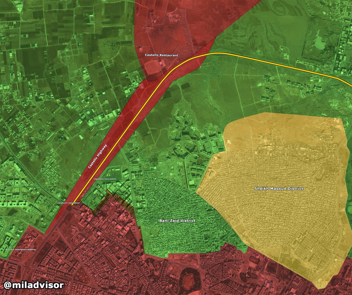 Положение в Аллепо на 23. 11июля. Карта отсюда https://mobile.twitter.com/miladvisor/status/752608767326482432 С севера трасса Кастелло находится под огневым контролем САА. С юга идёт наступление с промзоны Лерамун. Котелок вот-вот захлопнется [