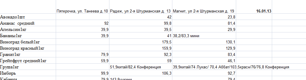 Боцман, я тебе привел цены января в крупнейших продуктовых сетях Волгограда. Так получилось, что у меня есть статистика по овощам. С января 2013 до декабрь 2015 гг.