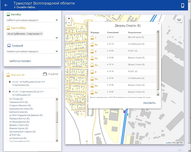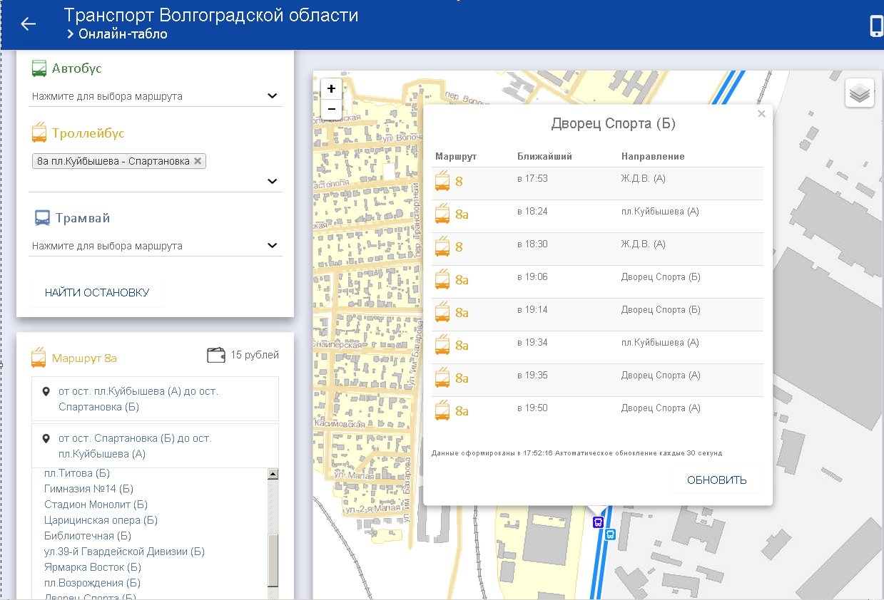 Итак, 9 марта, время 18:03 и вот что мы имеем (см. вложение). При этом троллейбус 8А пришел на "Дворец спорта" в 18:05, потому как в 18:06 я уже наблюдал его движение в сторону "Мамаева кургана", а, например, согласно услуге "SMS-транспорт" следующий троллейбус данного маршрута должен был подойти на "Дворец спорта" вообще в 18:24, а затем в 18:49, что опять-таки никак не совпадает с тем, что изображено на картинке. Продолжаю наблюдать за порталом.