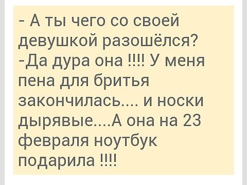 Я жену первым делом отучил мне подарки делать. Как раз чтобы не было носков, трусов, бесполезных наборов инструментов и сомнительных аксессуаров. А когда приходит пора делать подарок, то жена даёт своё молчаливое согласие на то, чтобы я потратил энную сумму из семейного бюджета на свою очередную «игрушку». В итоге все довольные: жена не забивает голову вопросом подарка, а я получаю именно то, что хочу. Например, не просто навигатор в машину, а монтируемый штатно в панель навигатор. Не просто часы, а именно с нужными мне корпусом, браслетом и характеристиками. Не просто крутой набор инструментов, а набор нужных мне инструментов. И так далее. В итоге всё подаренное мне за последние несколько лет реально используется и используется с удовольствием, а не пылится в углу. Если мужчина самостоятелен, то не надо ему дарить то, что он сам может себе купить, тем более если у вас общий семейный бюджет. Подарите ему то, чего он не может — своё внимание. Пусть у вас в этот день и всю следующую неделю/месяц/год «не болит голова». Отпустите его без лишних вопросов в бар с друзьями и не названивайте каждый полчаса, а к утру запаситесь бутылочкой пенного в холодильнике. Просто сделайте то, что он любит и будьте той, кого он любит. P.S. К мужику подходит дочка: — Папочка, дай пожалуйста 300 рублей. Даёт, потом подходит сын: — Пап, дай 500 рублей. Даёт, следом подходит жена: — Дорогой, дай 2000 рублей. Мужик не выдерживает: — Да что с вами сегодня? — А ты что, забыл? Завтра же твой день рождения (23 февраля).
