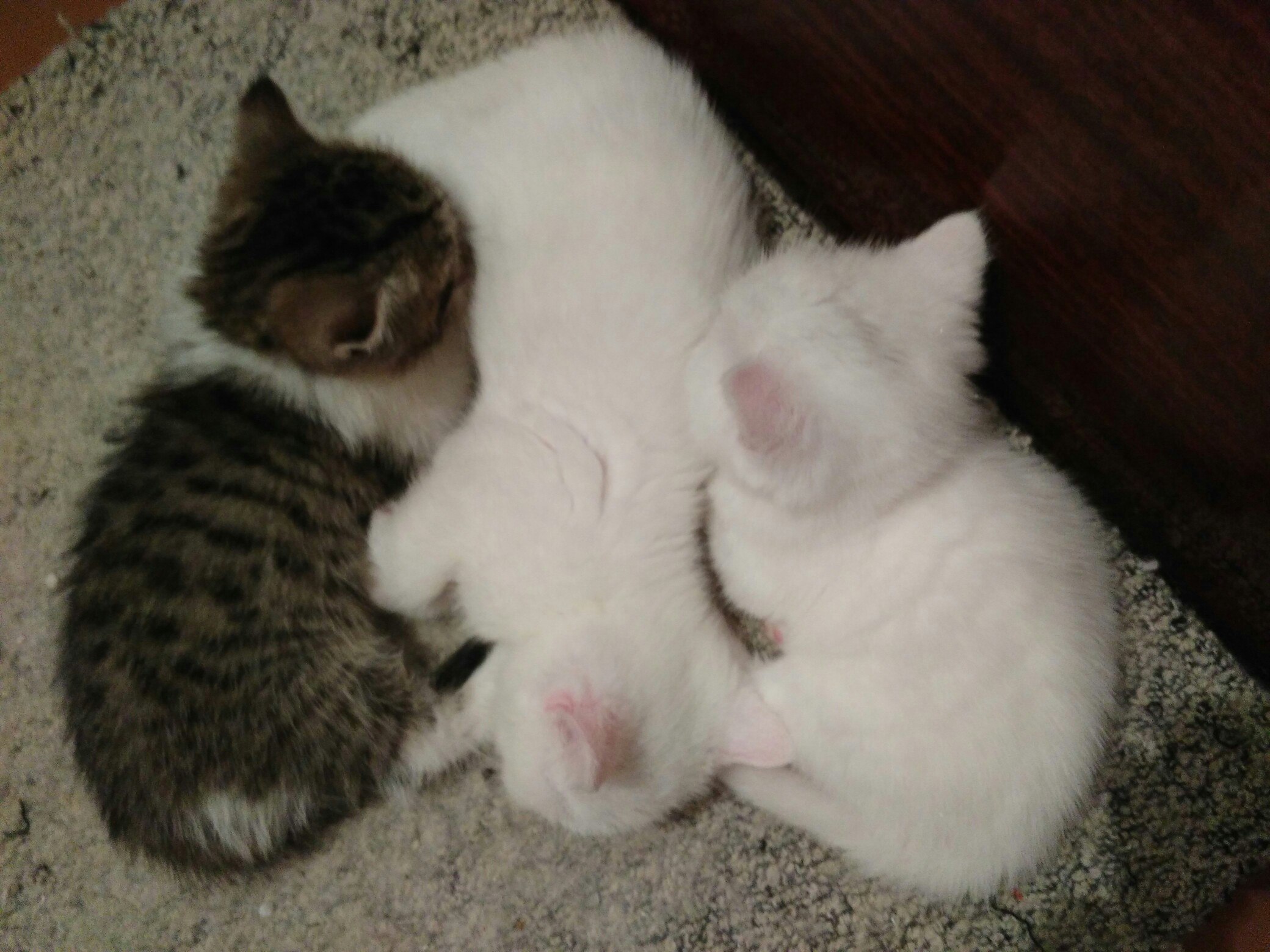 У одного из белых котят(на 1 фото) подозреваем глухоту, так как остальные два явно реагирую на шумы, а этот как-то меньше, но точно сказать нельзя. 2 белых - мальчики, пестрая-девочка.