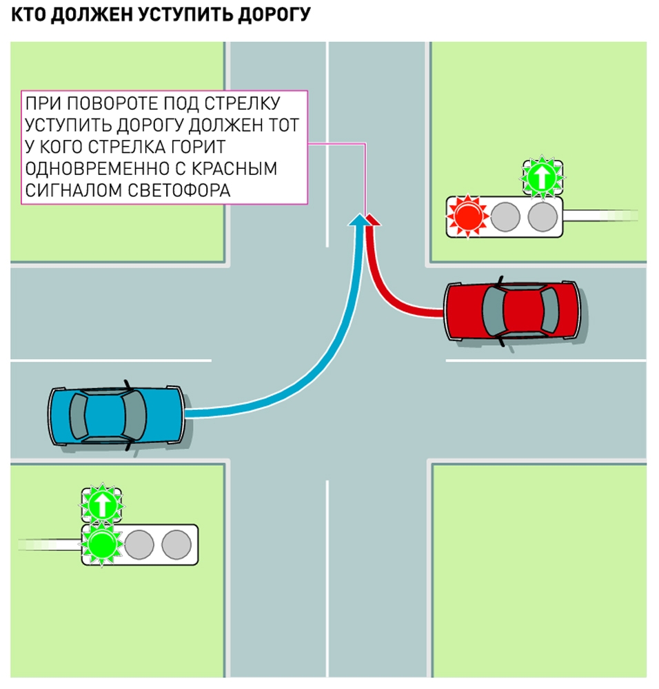 по-моему элементарная ситуация, проезжаешь на зеленую стрелку, при включенном основном красном светофоре должен уступать всем и ничего не додумывать.