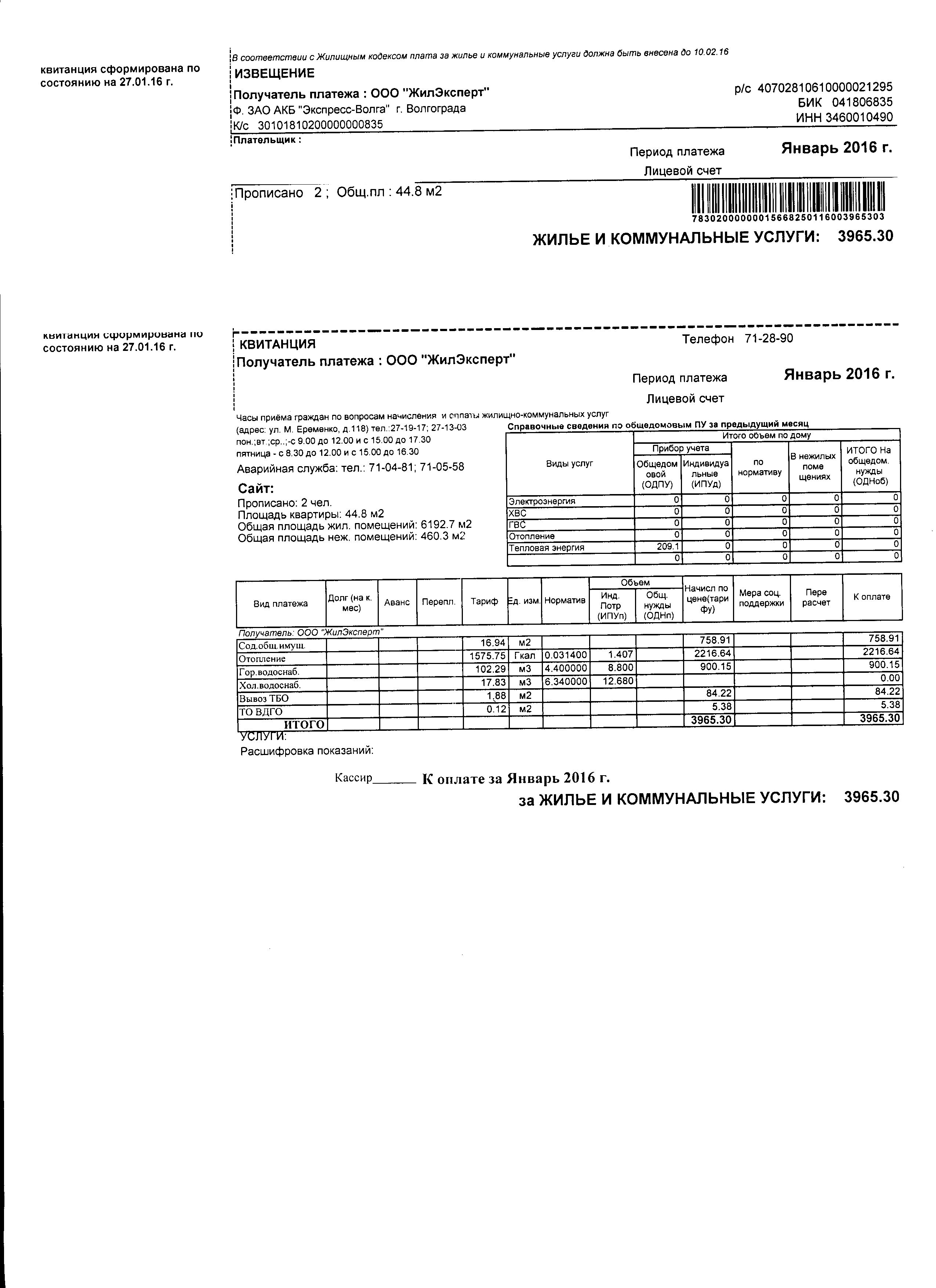Вы внимательно читали моё сообщение? Теперь по поводу " не мутите воду". Я по жизни не люблю пустых слов. Порядок предоставления коммунальных услуг собственникам и пользователям помещений в многоквартирных домах и жилых домах регламентируется постановлением Правительства РФ от 06.05.2011 № 354 (далее – Правила). Потребители с централизованным теплоснабжением оплачивают потребленную тепловую энергию на основании приборов учета или по нормативу. В соответствии с Правилами, в многоквартирном доме, который оборудован коллективным (общедомовым) прибором учета тепловой энергии и в котором не все жилые или нежилые помещения оборудованы индивидуальными и (или) общими (квартирными) приборами учета (распределителями) тепловой энергии, размер платы за коммунальную услугу по отоплению в жилом помещении (Pi) определяется исходя из показаний коллективного (общедомового) прибора учета тепловой энергии: Pi= Vд * Si / Sоб * Тт где: Vд — объем (количество) потребленной за расчетный период тепловой энергии, определенный по показаниям коллективного (общедомового) прибора учета тепловой энергии. Si — общая площадь i-го жилого или нежилого помещения ; Sоб — общая площадь всех жилых и нежилых помещений многоквартирного дома; Тт— тариф на тепловую энергию Я прикрепляю 2 файла:1. платежка за январь 2016г от управляющей организации и 2. платежка уже от ИВЦ " ЖКХ и ТЭК". Обратите внимание на начисление отопления с учетом приведенной формулы. И станет ясно что я имею в виду. Нежилое помещение арендует наша управляющая организация у недвижимого имущества муниципальной имущественной казны Волгограда. А что могло произойти при переносе платежки из управляющей организации в РСО МУП ВКХ? Может быть вышло какое-нибудь новое Постановление Правительства РФ? Просветите. Кто позволил нарушать закон? Вот о чем я предупредил жителей моего города Волгограда.