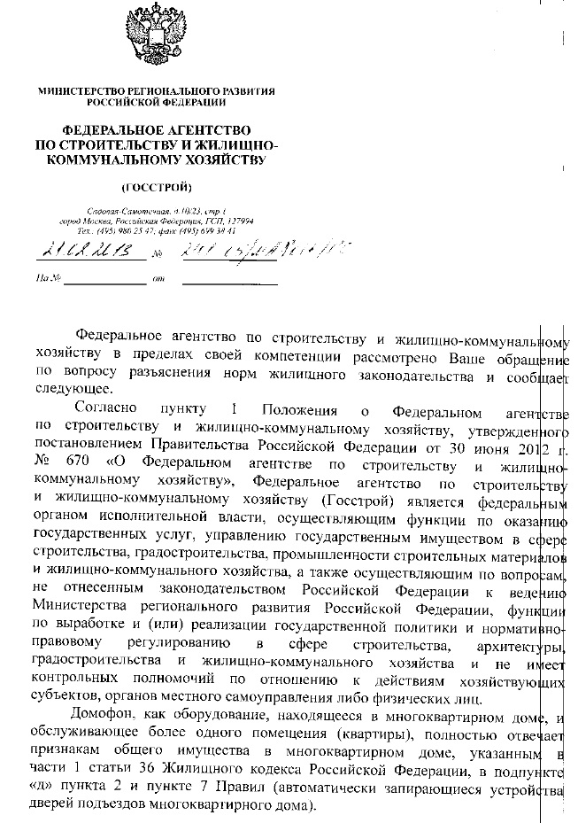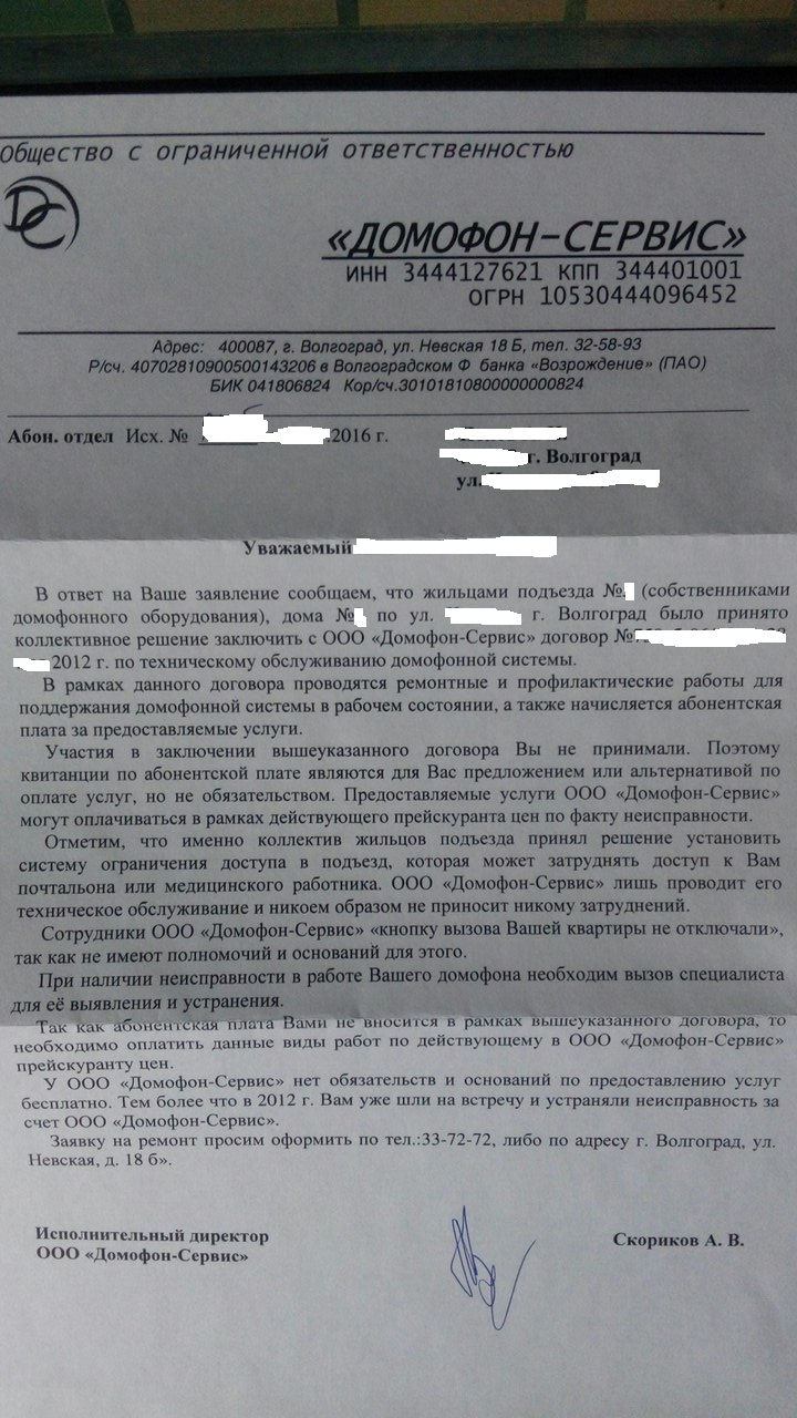 Письмо - полный бред! 1. Внесение абонентской платы будет являться моментом заключения договора. Оплатил квитанцию = заключил договор. 2. Собственники одного подъезда (если дом многоподъездный) не могут принять решение по условиям содержания общего имущества. Решение по содержанию домофона, если это общедомовое имущество, может принять только ОСС. 3. А уж если решение приняло ОСС, а какой-то из собственников не принимал участия в собрании, то, согласно ЖК РФ, решение ОСС является обязательным для всех и каждого собственника. В этом случае оплата квитанции - это обязанность, но не предложение. "Решение жильцов подъезда" Жесть! Ну, и, vrio, прав власть имущим похрен на домофонный беспредел. Всё общедомовое имущество, включая домофон, ОБЯЗАНА обслуживать УК.