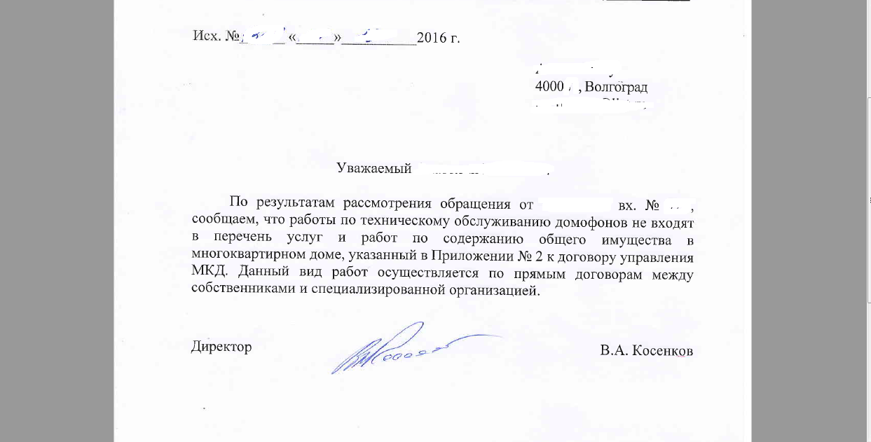 Опять отключили домофон, при нажатии вызова квартиры надпись "отключена". В день написания ответа на жалобу, домофонщики подключили квартиру, но где-то специально оборвали провод в квартиру. Кстати, в 2012 году ничего у меня не ломалось, никто ничего не делал. Откуда они это взяли, не знаю. Квитанции по абонентской плате являются предложением