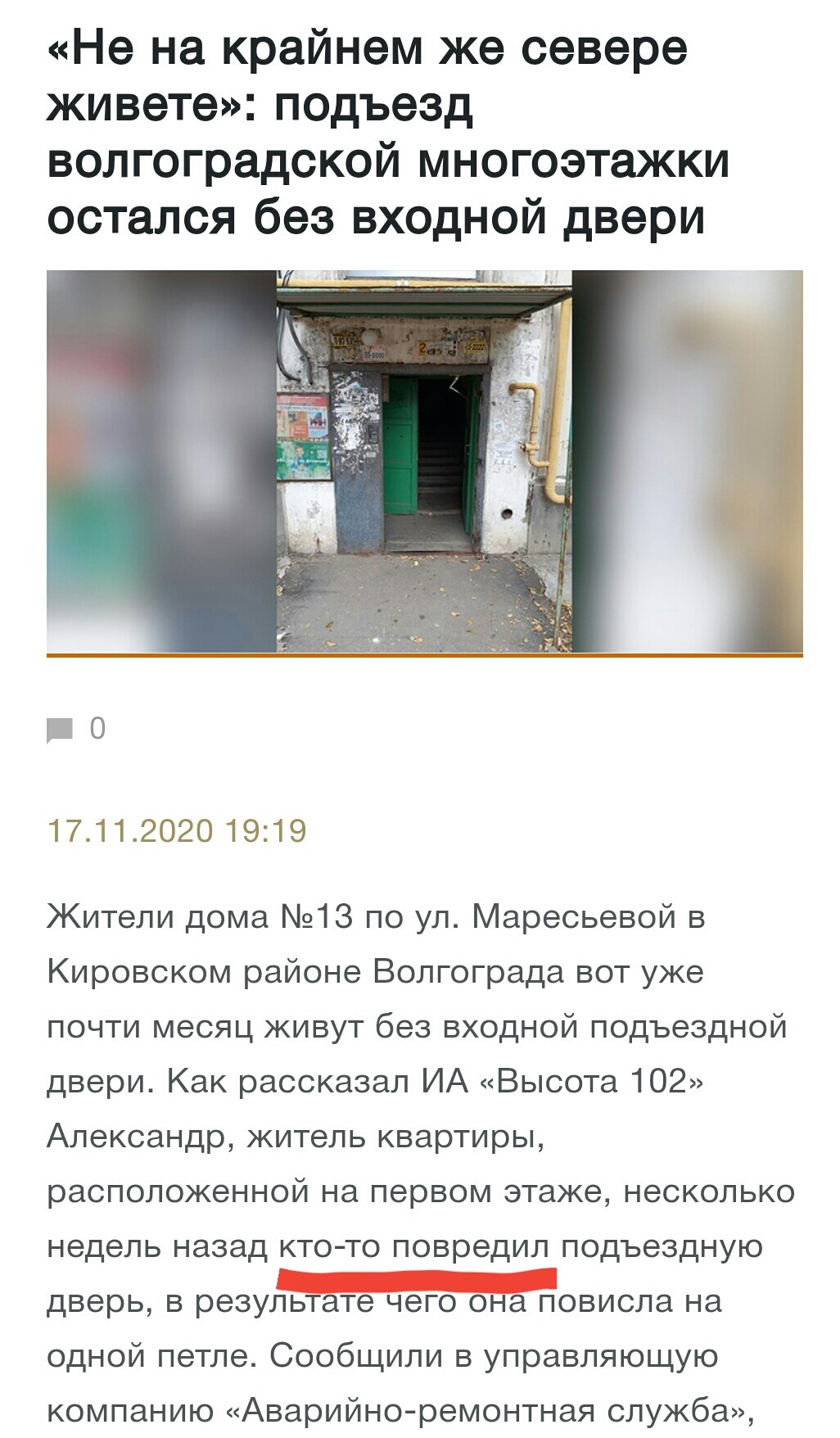 ладно врать то ! Вчера или сегодня статья была что дверь ветром вырвало одну петлю. Пока УК чесало ****, дверь бомжи отнесли на сдачу