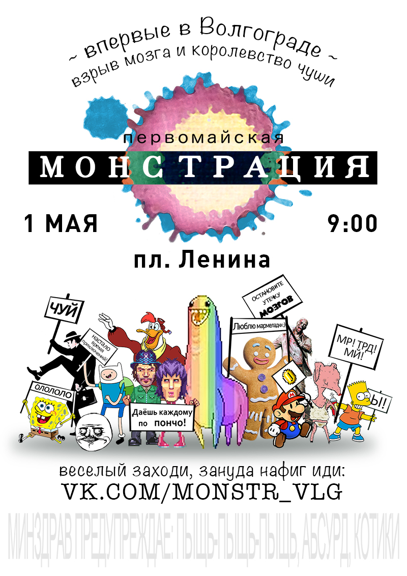 Поздравленцио, товарищи! Вчера волгоградская Монстрация наконец была согласована, тем самым обретя статус полного легалайза. Ура! Остается полторы недели, самое время обзвонить всех своих друзей и написать единомышленникам в соцсетях, чтобы они присоединились к нашему безумному шествию, а также склеить свои плакаты и сшить костюмы (если кто этого еще не сделал). Ударим абсурдом творчества по абсурду реальности! :D *звучат вялые апплодисменты и кашель трубача* P.S. Ткань для главного транспаранта куплена, часть плакатов заготовлена, пионерский горн на подвозе.