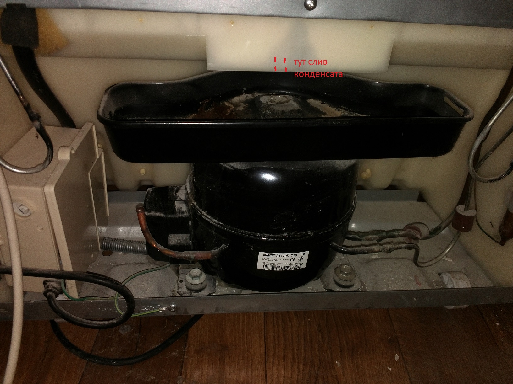 холодильник самс rt-30 mbmg. под ним в последнее время периодически стала появляться лужица воды. Капает из-под комрпессора, стрелочкам на фото отметил. С дренажного слива капает в поддон- все норм. Отодвигал холодильник, смотрел где может протекать, но так и не нашел ничего, мокрая только металическая сетка, которая отмечена стрелками- находится она точно под компрессором. МОжет ли быть эта лужа из-за того, что часто открываем проветривать окно на несколько часов. Ну типа от этого конденсат получается Или бред ? Если кто разбирается-подскажите