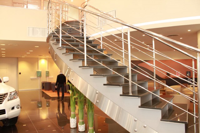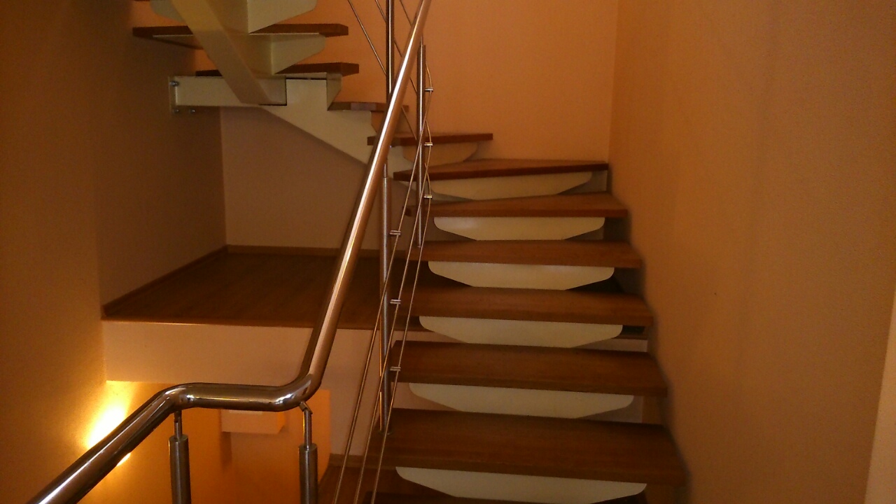 такая лестница по стоимости выходит очень уж не слабо, делали соседи и знакомый к себе в магазин... я себе залил бетонную и со временем отделаю деревом (на 2-ой этаж) или плиткой (в цоколь). Бетонная с забежными ступеньками выходила по 20-25 тыс. за пролет (2 пролета по 17 ступенек). По металлическим предложения начинались от 80тыс., а такая как на картинке от 120 тыс. и это без отделки деревом и без перил... Зы: было 2 года назад (сейчас по ценам не в курсах) и контакт утерян с убийством телефона...