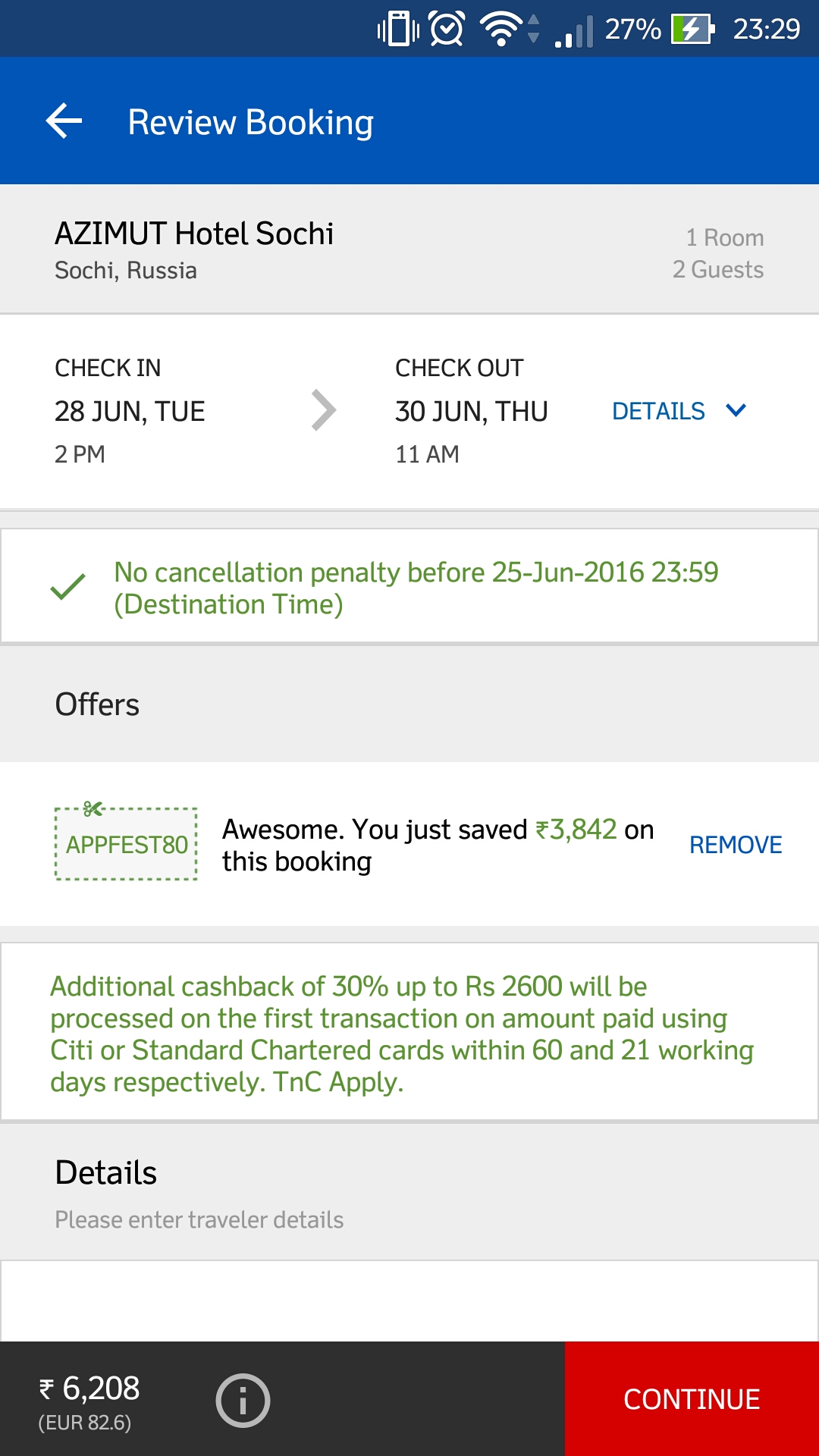 Залетный гость, написал же Перед оплатой дает промокод применить appfest80. По две ночи потому что скидка максимальная только так получается. С 3й ночи уже скидка не прибавляется. Себе сделал 3 раза по 2 ночи каждый отель. Азимут сейчас 5200 самый дешевый вариант на двоих с завтраком стоит у всех, а не 4400. Потому и запостил. Выгода реальная получается. Но недолго блин.