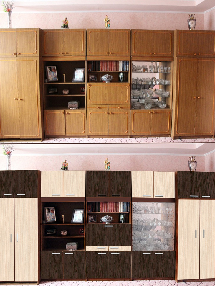 Имеется стенка в зале, 80х годов. Достаточно функциональна и не убита (только в книжном шкафу у окна видно выгорание от солнца), дизайн устаревший, но в меру. Зато она не сильно большая и высокая, не давит пространство. В средней части - сервизы, по бокам книги в шкафах. Хочется как-то осовременить, освежить... может, достаточно будет заменить фасады и обновить стекла? Или не мучиться уже и покупать новую? Дешевые - хлипкие, либо громадины и задорого. ЗЫ. Есть еще тумбочка, вровень к нижним, одного дизайна. Под телек использовать между шкафами