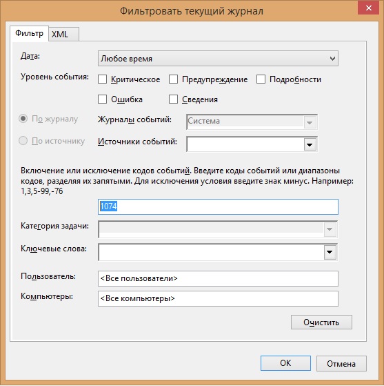 В журнале событий используй фильтр и код (1074), Люк.;)