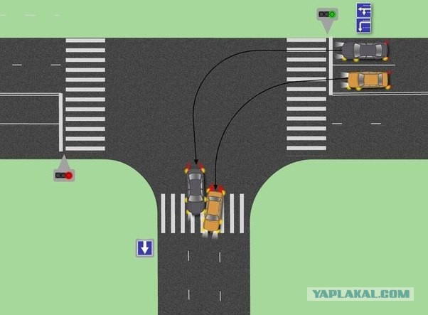 Тут нет встречки, если бы серый ехал в свой ряд, то линии были почти параллельными. ---------- Сообщение добавлено 22.08.2016 16:47 ---------- Данная картинка не пример для определения кто сзади, может желтый не сразу тормознул от удивления и крылом прочиркал до двери Смысл, кто в какой ряд должен поворачивать?