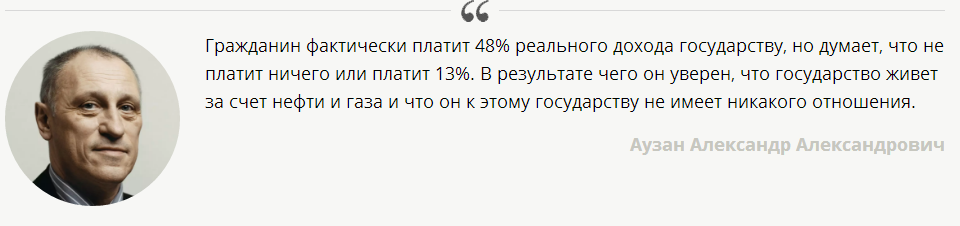 Золотые слова!!! Вот поэтому я будучи фактически работодателем, сам себя не оформляю на работе - очень невыгодно. Плюс еще добавить, что с полученных денег, когда Вы начинаете их тратить вы еще платите всякие НДС, акцизы т.е можно еще и с них отминусовать, т.е налог получится больше 50% даже, а разговор про 13% это чистой воды обман. А сколько еще государству денег перепадает при покупке новой машины??? Т.е, если Вы все время откладывали зарплату на покупку новой машины, фактически вы заплатите много больше 50% от зарплаты.