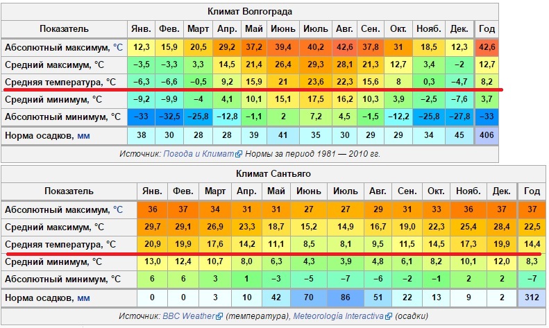 Средняя температура зимой в Волгогаде (февраль) минус 6,6 °C Средняя температура зимой в Саньяго (июль) плюс 8,1 °C в Саньяго абсолютный!!!! минимум -7°C Климат практически одинаков... Это новый тренд, чтоли? То пишут, что в Мурманске, зимой теплее, то в Сантьяго ни разу не жарко чуть теплее чем у нас. Что происходит? p.s. Самый холодный месяц зимы в Сантьяго похож на октябрь в Волгограде. Сравните во вложении показатели, если кто сомневается.