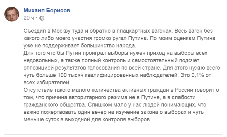 Далеко не факт. Сейчас хорошо налажен процесс полной независимости власти от народа. Вообще без проблем приемника поставить, если только не перегрызуться все. Вот на этих выборах спокойно можно было приемнику обеспечить процентов 60-70 голосов. Достаточно глянуть на Грудинина. Достали из жопы и сразу вон рейтинг неплохой. А если бы своего достали именно с задачей поставить на пост? Легко рейтинг был бы больше, чем у Путина был. Все, поддерживающие власть, и так за него проголосуют + много голосов, кто недоволен властью, так как это новый человек с несколькими правильными лозунгами на изменения. И всё. Ещё 10 лет можно не обращать внимания на выборы.