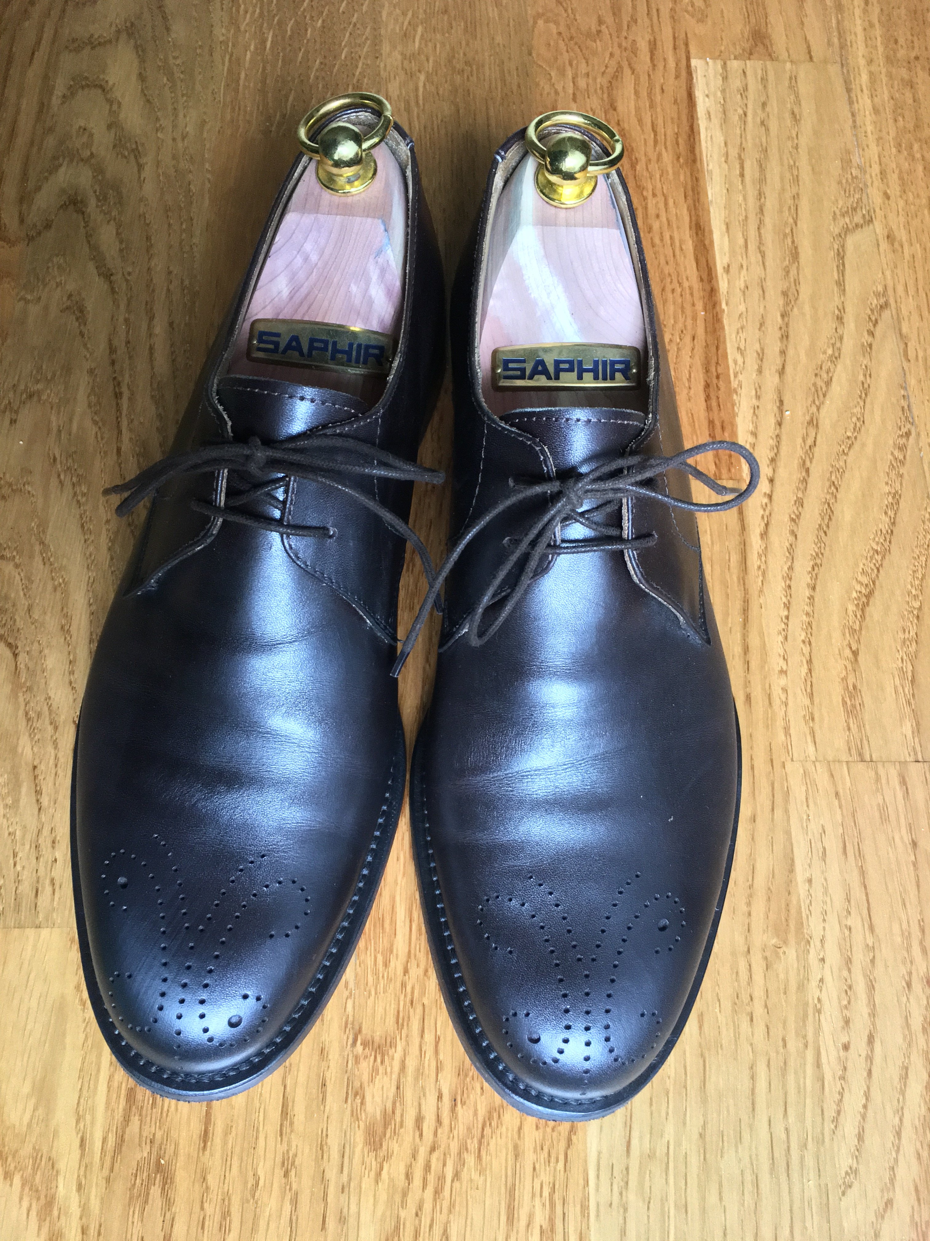 Приветствую. Сразу после этой просьбы сломался Айфон, но память о запросе осталась на задворках сознания) Вот фото одной пары, вторая ушла на работу) Носятся, не очень активно, но все же носятся. Купил цветные крема Saphire, лучшие из доступных на рынке, кедровые распорки, в общем, ухаживаем. Может поэтому и выглядит после года носки неплохо.
