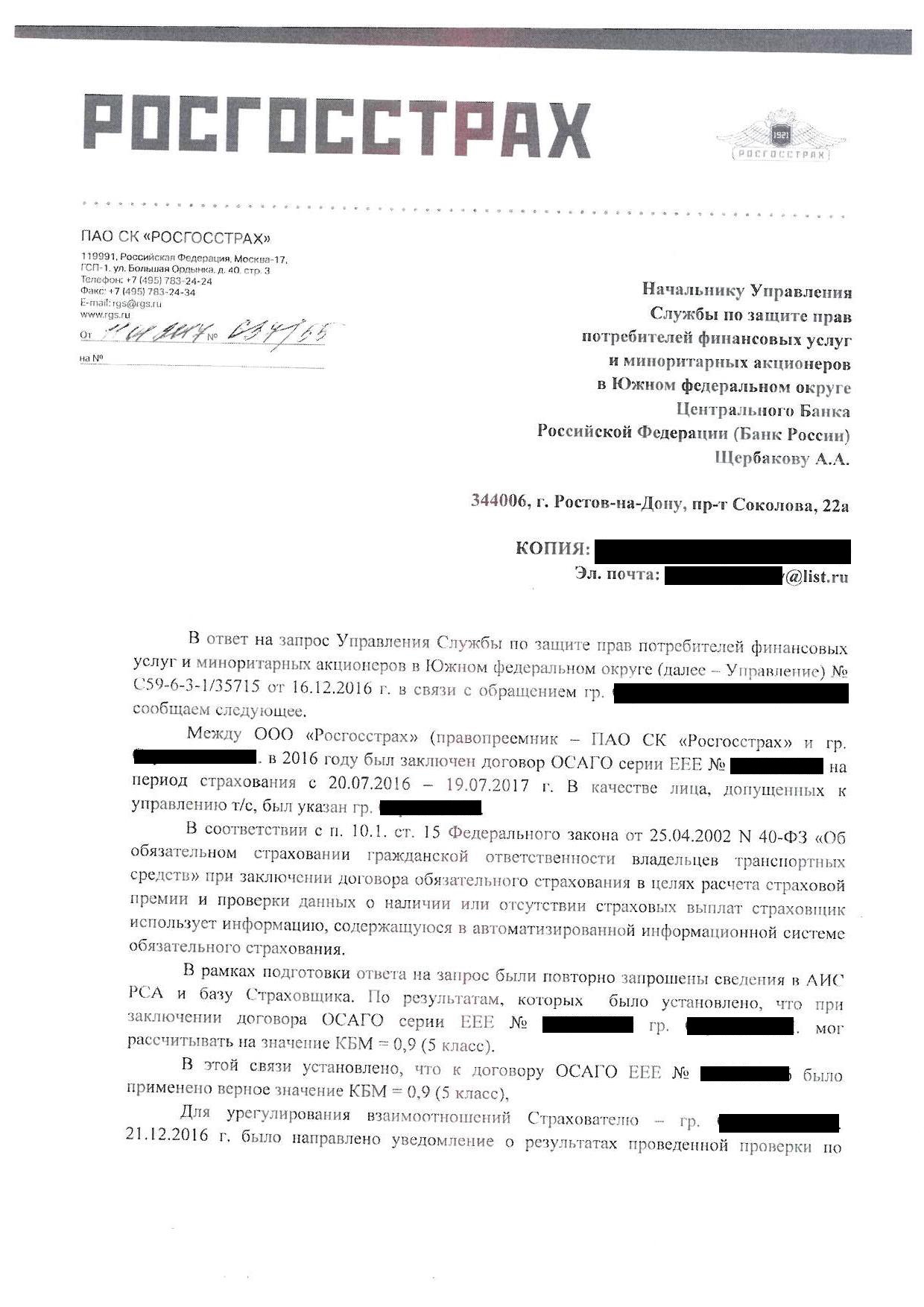 Осталось двойственной ощущение от всего этого. С одной стороны девчонкам, которые все оформили сегодня, реально большое спасибо. Это первые сотрудники компании Росгосстрах, которые вели себя по человечески. Были культурны и отзывчивы, а не плевали через губу с высока. С другой стороны сегодня же получил письмо от РГС в ЦБ (копию мне) с официальным ответом, которую прикладываю к посту.