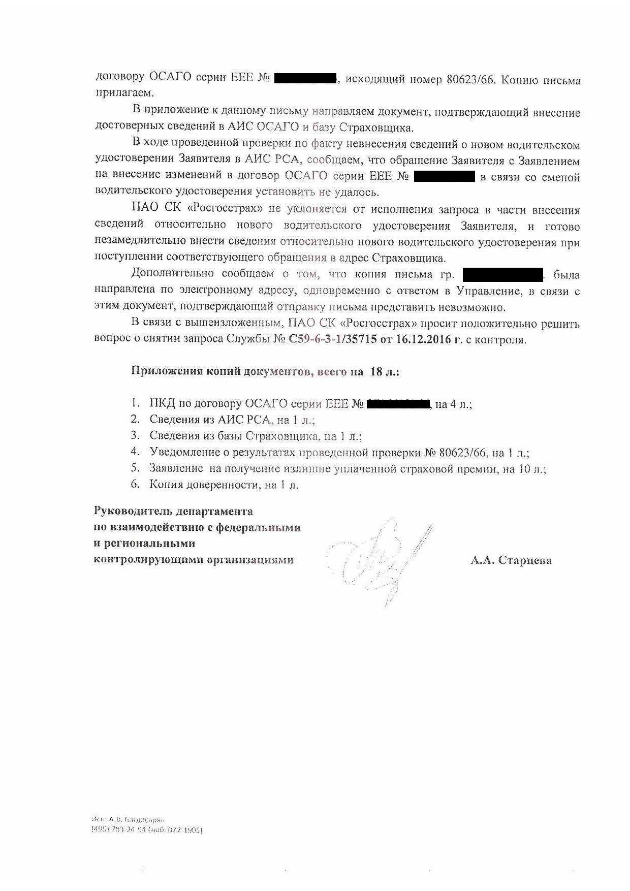 4. В компанию Росгосстрах я направлял заказным письмом с уведомлением о доставке письмо, в котором ставил в известность о факте смены прав и просьбой внести эти права в базу АИС РСА с сохранением КБМ. На что мне был прислан письменный ответ с формальным отказом. Конечно мое письмо они сколько не искали, сколько не старались, так и не нашли. Не иначе Госдеп виноват, окоянныя!