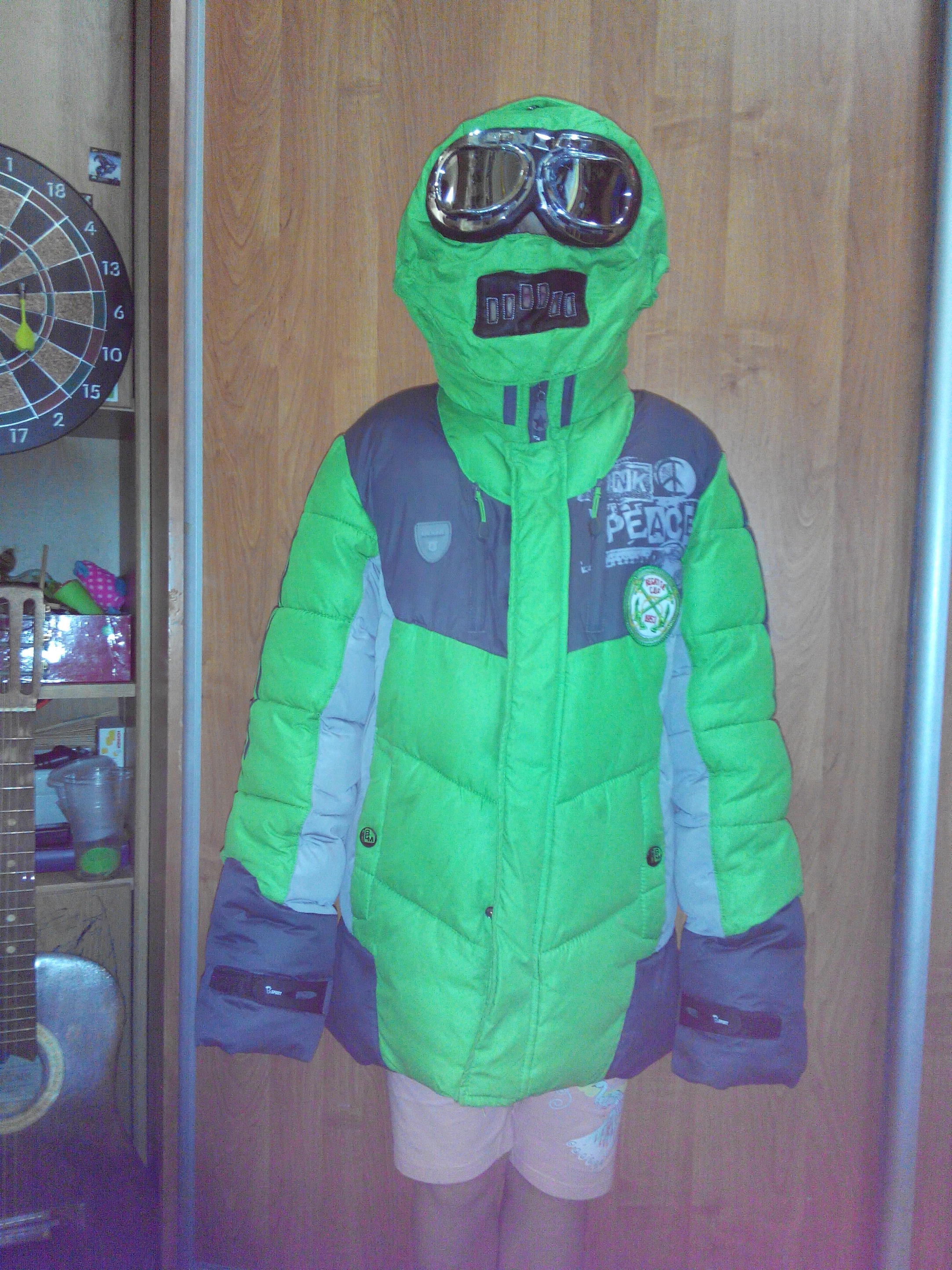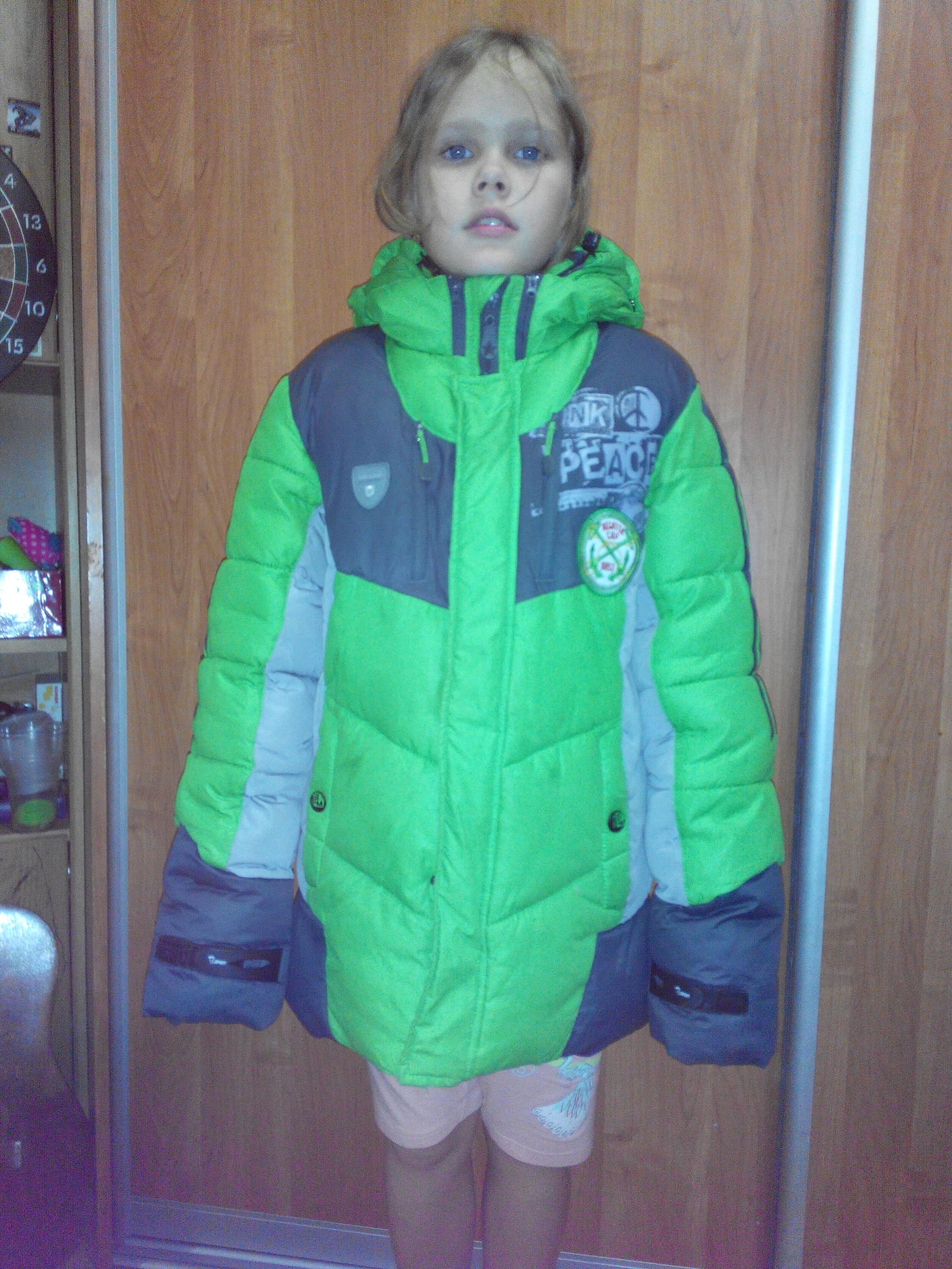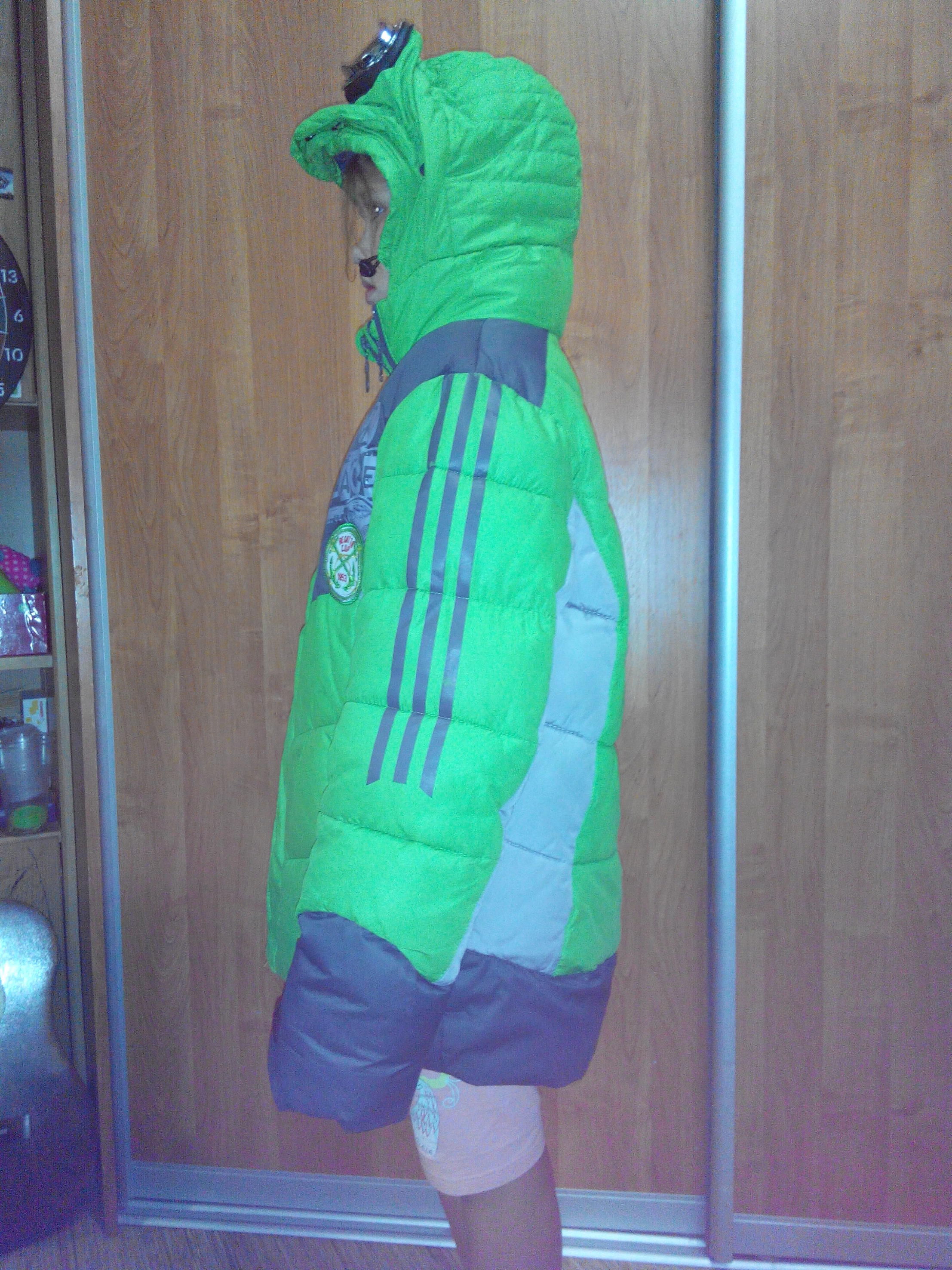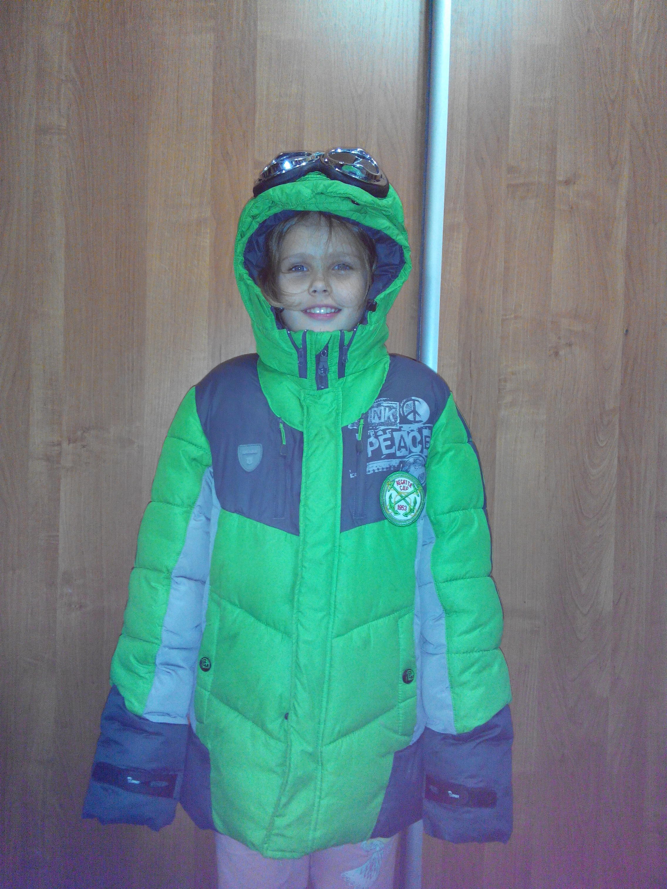 Итак, обещанные фото. Модель ростом 134, соответственно, видно, как на ней сидит куртка - так что, размер лучше подойдет на рост 146. Маска отстегивается.
