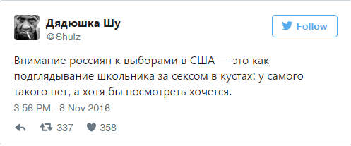 Во время подсчета голосов, одна из ведущих журналистов CNN вела прямой репортаж из "американского" бара в Москве. Она пытала на английском москвичей, оказавшихся в баре по поводу отношения к кандидатам. https://www.facebook.com/cnn/videos/10155575611981509/ к концу десятой минуты (10:50) репортажа она подошла к столику, где сидела моя сестра и племянник. Племяша Семен дал понять америкосам, что у нас в избах и телевизор есть и интернет... Потом нам признался, что немного подмазал ведущей с ответами, хоть и не знал, что она из CNN и он в прямом эфире. В комментах CNN много обсуждений того, откуда в Москве знают английский?