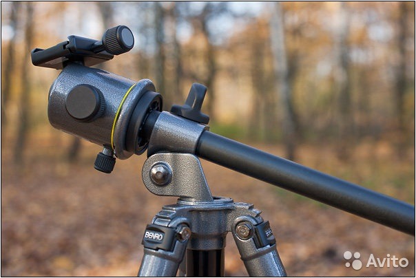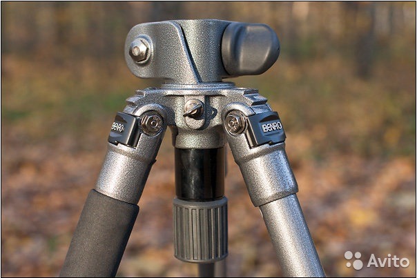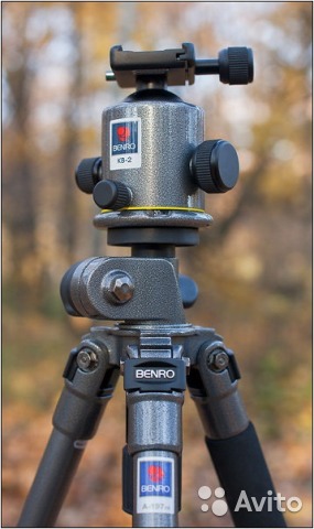 Штатив Benro A-197 и головка Benro KB-2 Штатив в отличном состоянии. Ноги алюминиевые, трёхсекционные, держат 4,5 кг, сами весят 1,82 кг. Одна из важнейших особенностей — возможность съёмки с низкого уровня (почти с земли). Ноги можно устанавливать на трёх разных углах. Центральная штанга вытаскивается, переворачивается и поворачивается на любой угол. На одной из ног есть мягкая ручка для переноски, а на центральной штанге есть крюк для подвешивания груза. Есть встроенный уровень и даже компас. Резиновые наконечники можно заменить входящими в комплект стальными шипами. В комплект входит удобная сумка с толстыми стенками и кармашком для инструментов внутри. Голова Benro KB-2 Держит 18 кг, сама весит 0,76 кг. У головки есть три ручки: собственно фиксация шара, регулировка тормозного усилия и зажим кругового вращения (вся голова вращается относительно основания). Есть предохранитель площадки (серебристая кнопка). Сама площадка типа Arca Style, т. е. совместима с железяками всех приличных головочно-железячных фирм — например, можно использовать L-plate Really Right Stuff. (Говорят, что именно серия KB не совместима из-за наличия предохранителя, а совместима серия B. Но, всё-таки можно пользоваться штуками Arca Style, если открутить предохранитель.) В комплекте — сумочка и ключ. Все вопросы и предложения в ЛС ! Спасибо !