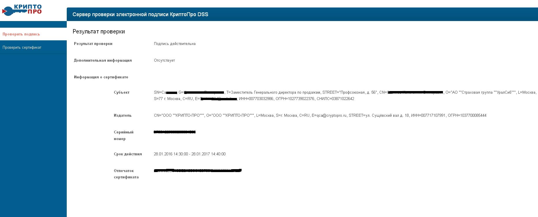 Там для проверки нужна ещё отдельно подпись, отдельный файл подписи загружать, а у ВСК она типа присоединённая, поэтому никак не проверить по этой ссылке, только если отсоединённая, может ещё как-то можно? ---------- Сообщение добавлено 12.01.2017 14:26 ---------- Все, проверил, только по другой ссылке https://dss.cryptopro.ru/Verify/Home/ Там все прошло, подпись действительна