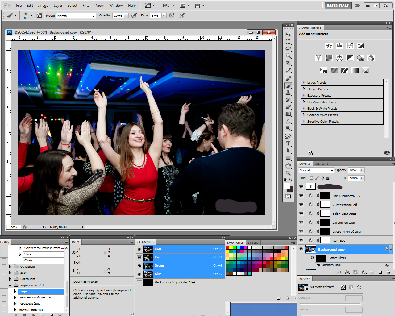 А меня эти ваши новые фотошопы бесят своей долгой загрузкой и мелкими подтормаживаниями при работе. Похоже, что ЦС3 был написан ещё на сях, в крайнем случае, плюсах, а новые - на каком-нибудь богомерзком C# или Java. В то же время, новые фишки мне попросту без надобностев. По сути, единственное, чего не хватает в ЦС3 - привязки маски слоя к смарт-объекту, но это очень редко бывает нужно и худо-бедно обходится через группы слоёв. Расположение окон практически дефолтовое, инструменты мало какие настроены, зато куча экшЫнов с шибко секретными названиями. Из них, правда, процентов 90 удалить бы надо по причине многолетнего неиспользования, но жалко, они ж как родные стали за долгие годы нашей совместной жизни.