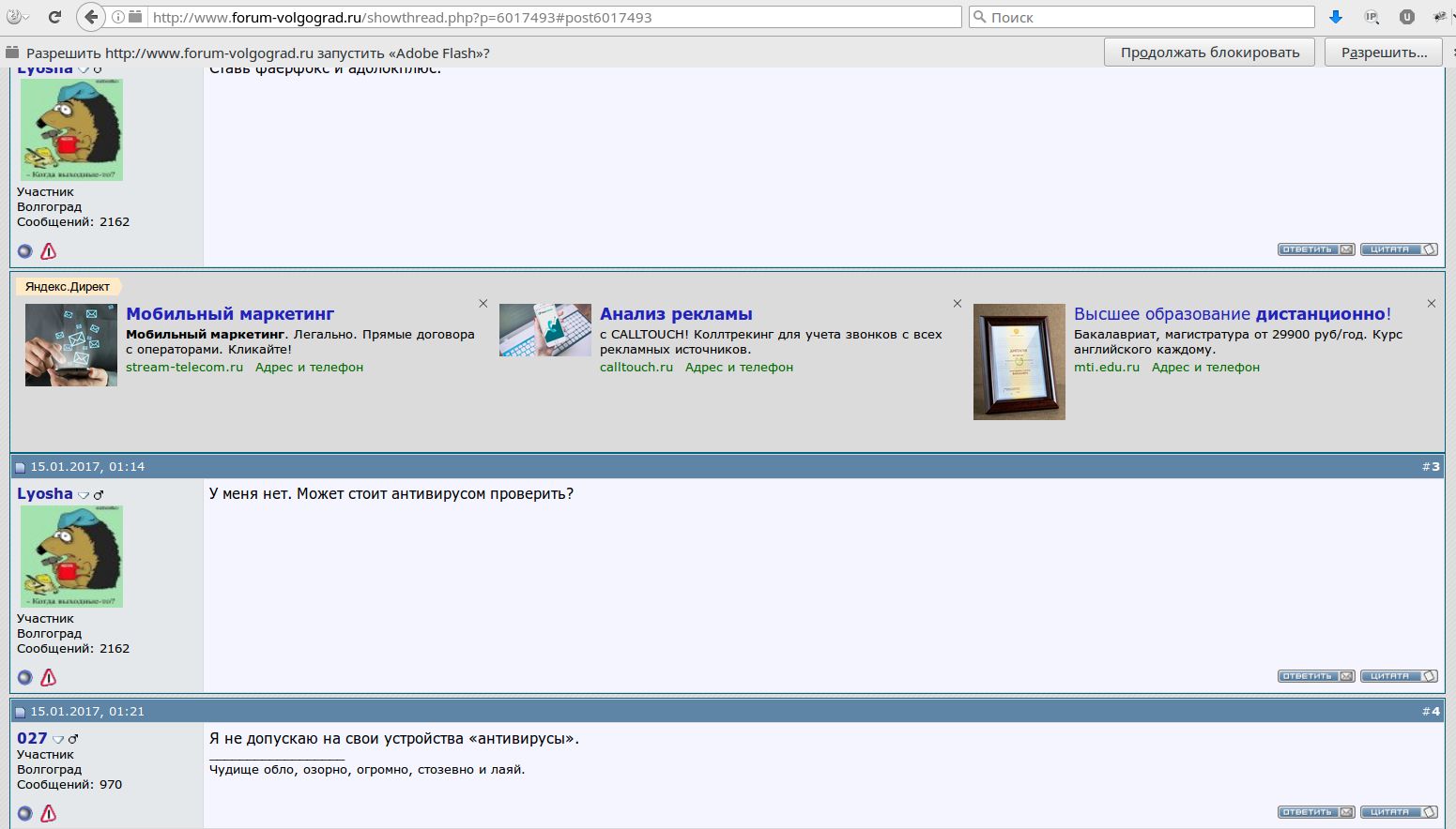 Не обращаю внимания на содержимое, но последнее время просто стала вымораживать на множестве ресурсов, и волгоградский форум не исключение. Я вот не хочу ничего ставить, я даже знать не хочу, какой у меня браузер в девайсе, а хочу просто зайти и посмотреть интересующую меня информацию(а не которую кто-то зачем-то мне пытается подсунуть), вместо этого - приходится постоянно закрывать оповещение Не удалось установить защищенное соединение. Вот кем надо роскомнадзору заниматься, агрегаторами рекламного бреда, всякими яндекс директами, и прочей дрянью! Я понимаю, что кушать всем хочется...